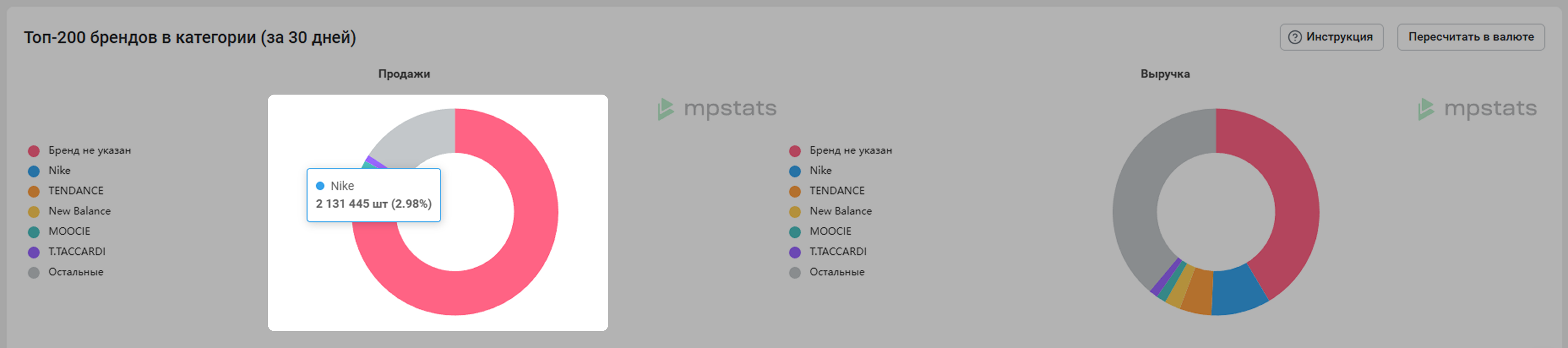 Отчет по брендам показывает, какие бренды вошли в топ-200 по выручке за выбранный период. Здесь можно увидеть подробную статистику по доле бренда в анализируемой категории.