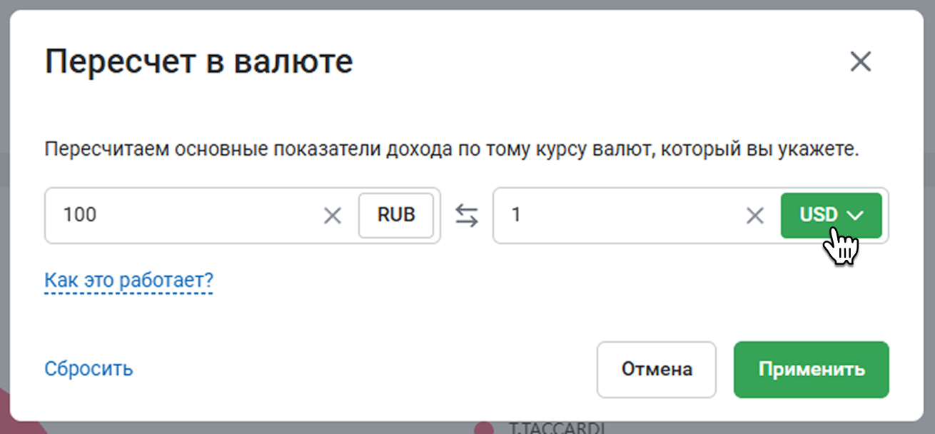 Например, сейчас выручка 10 000 ₽. Вы указываете, что 1 $ равен 100 ₽. Когда вы нажмете Применить, в таблице в графе Выручка будет 100.