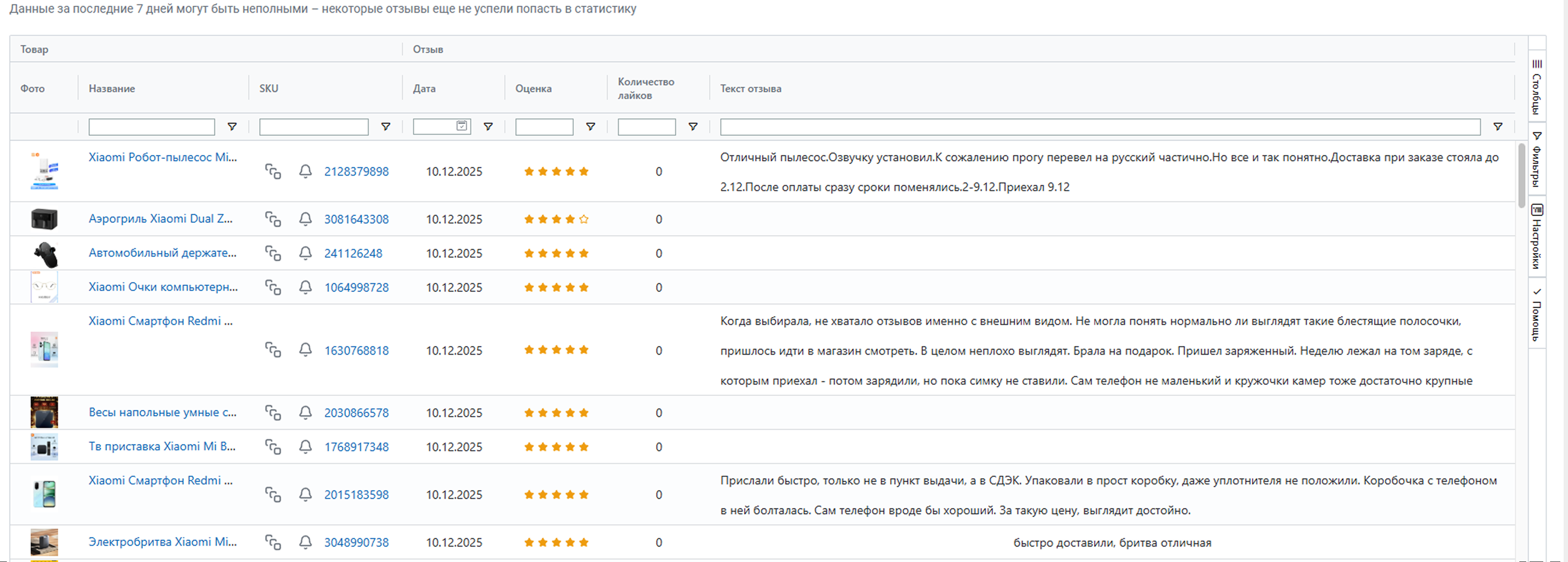 Отзывы к товарам загружаются в отчет постепенно. Поэтому данные за последние 7 дней могут быть неполными – некоторые отзывы еще не успели попасть в статистику