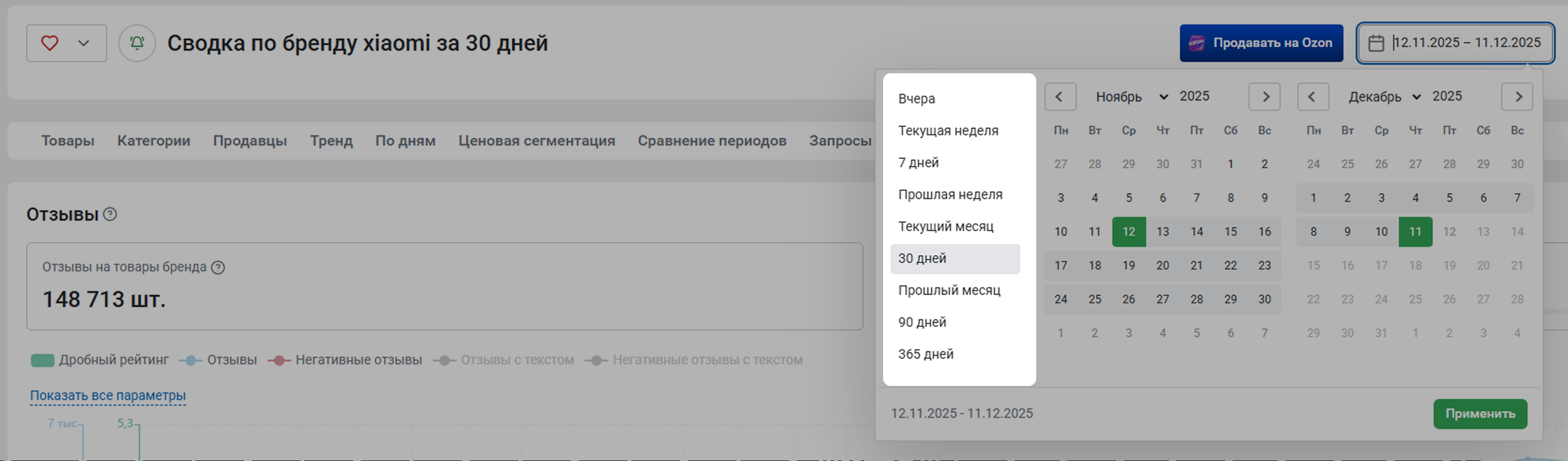 Автоматически отчет формируется за последние 30 дней, но вы можете выбрать другой период. Нажмите на поле со значком календаря и выберите временной промежуток. Нажмите Применить.