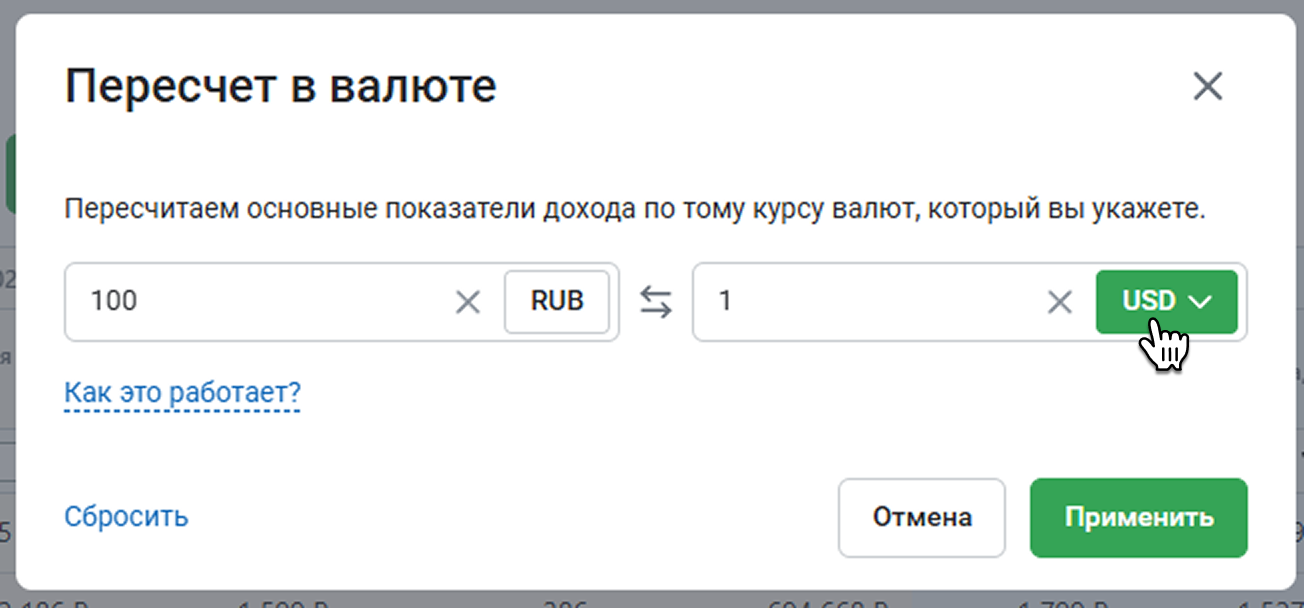 Пересчитаем основные показатели дохода по тому курсу валют, который вы укажете.