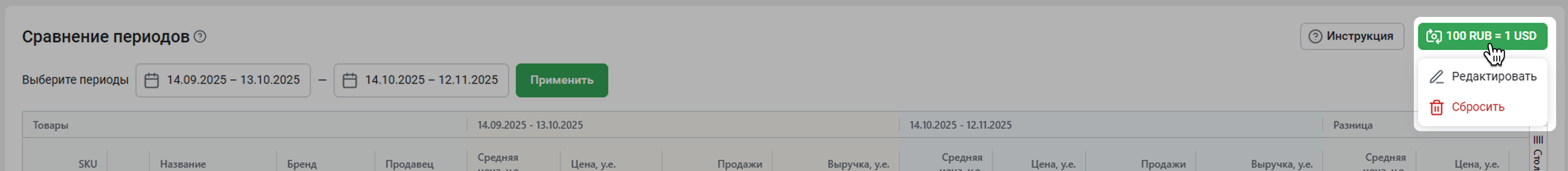 Указанный вами курс отобразится справа над таблицей. Если вы нажмете на него, откроется меню. Нажмите Редактировать, если нужно изменить курс и пересчитать показатели. Чтобы вернуть таблицу к изначальному виду, нажмите Сбросить.