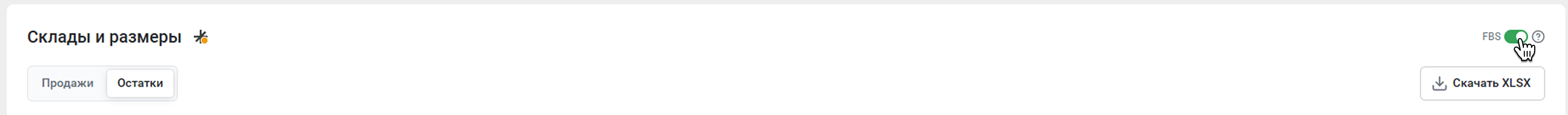 По умолчанию показываем в блоке данные только по FBO (продажи со складов маркетплейса). Чтобы посмотреть статистику FBO+FBS, активируйте переключатель FBS.