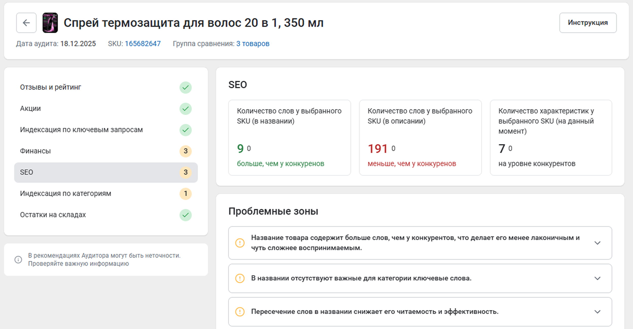 Инструмент покажет, есть ли у карточки проблемные зоны по каждому из параметров – в желтом кружке вы увидите количество таких зон. Справа инструмент покажет основные показатели карточки в сравнении с конкурентами и перечислит все найденные проблемные зоны.