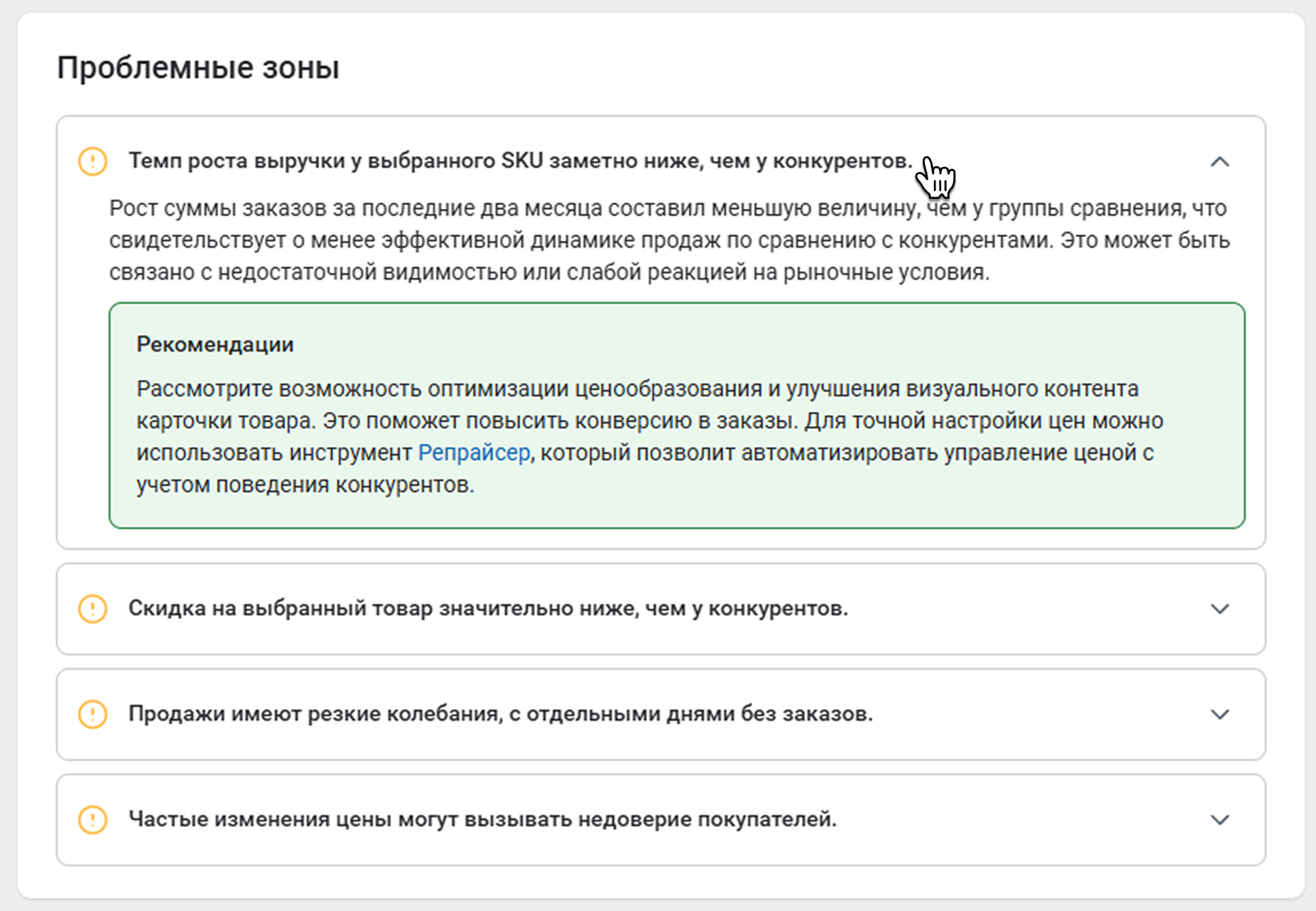 Нажмите на проблемную зону, чтобы узнать о ней больше. Аудитор SKU подскажет, какие инструменты MPSTATS помогут решить проблему.