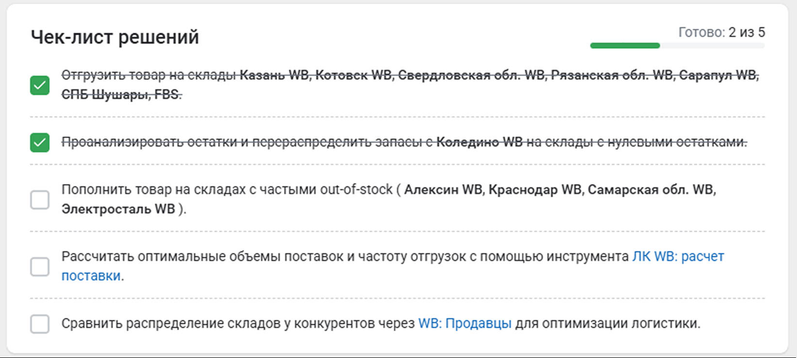 Инструмент предложит решения для найденных проблем и оформит их в чек-лист. Следуйте рекомендациям Аудитора SKU, улучшайте карточку и отмечайте выполненные действия.