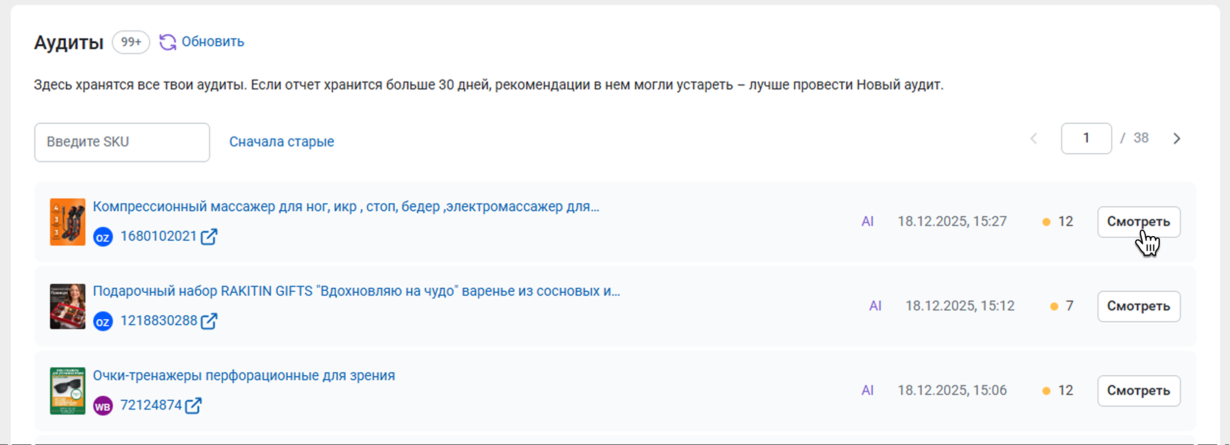 У любого аудита есть «срок годности». Если с момента создания отчета прошло какое-то время, он становится неточным – в вашей карточке или карточке конкурентов могло что-то измениться. Чтобы получить актуальные рекомендации, рекомендуем проводить аудит не реже 1 раза в месяц