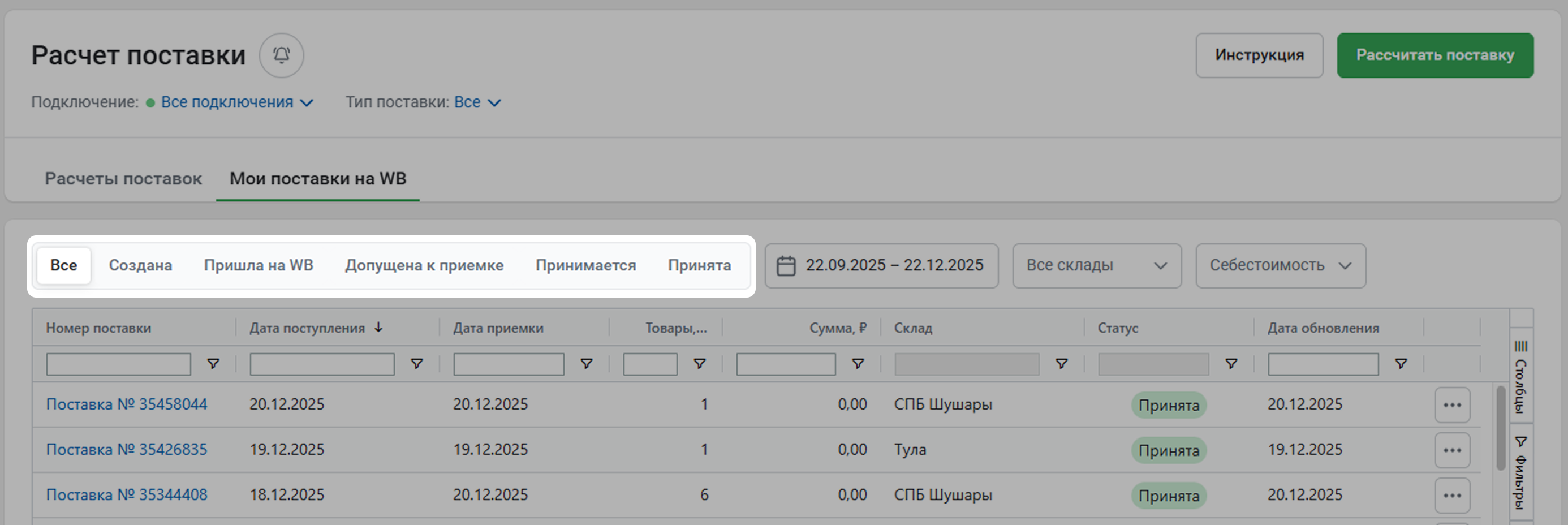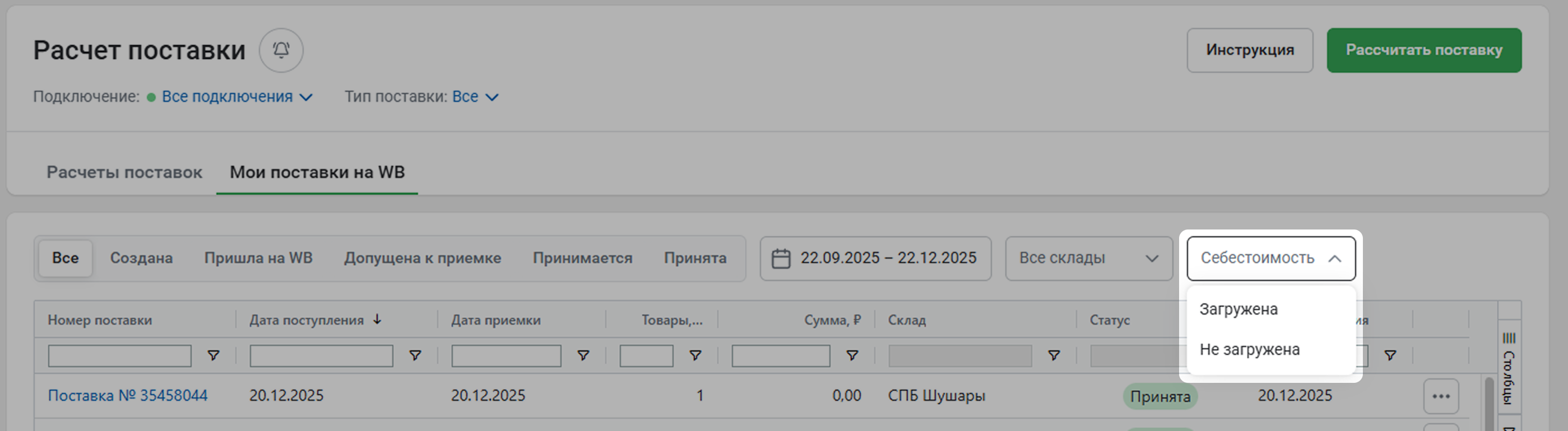 Инструмент Мои поставки на WB поможет загружать актуальную себестоимость товаров в поставке и отслеживать ее статус.
