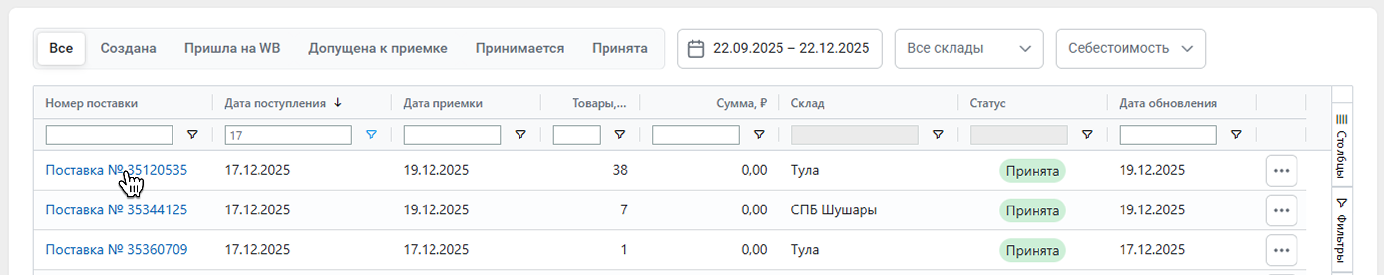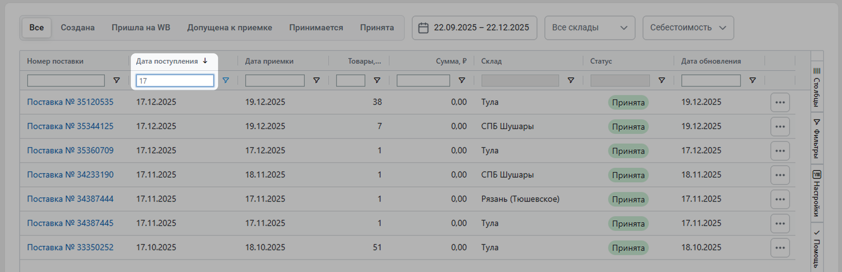 В таблице можно искать поставки по конкретным данным. Например, чтобы найти все поставки, которые поступили 17.12.2025, введите эту дату в поле Дата поступления.