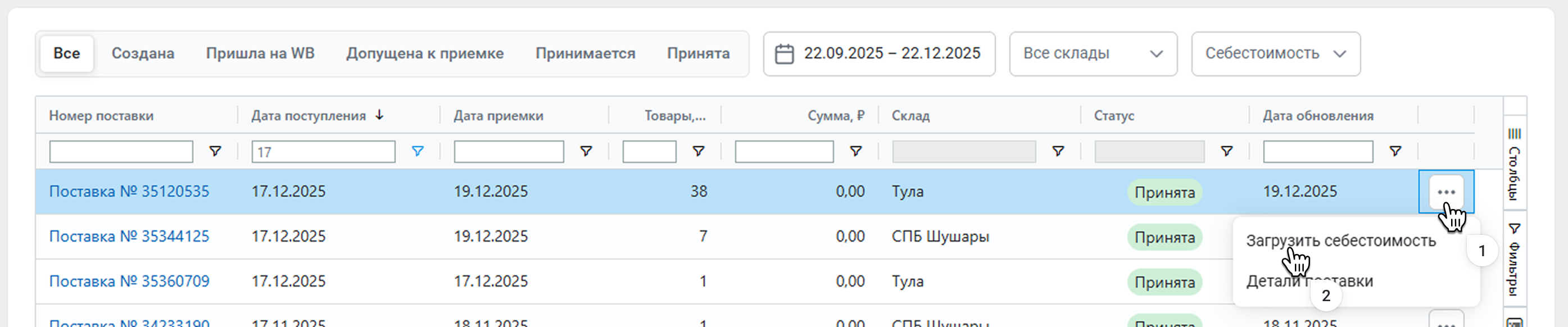 Себестоимость можно загрузить из таблицы поставок. Для этого нажмите на три точки в строке с нужной поставкой и выберите Загрузить себестоимость.