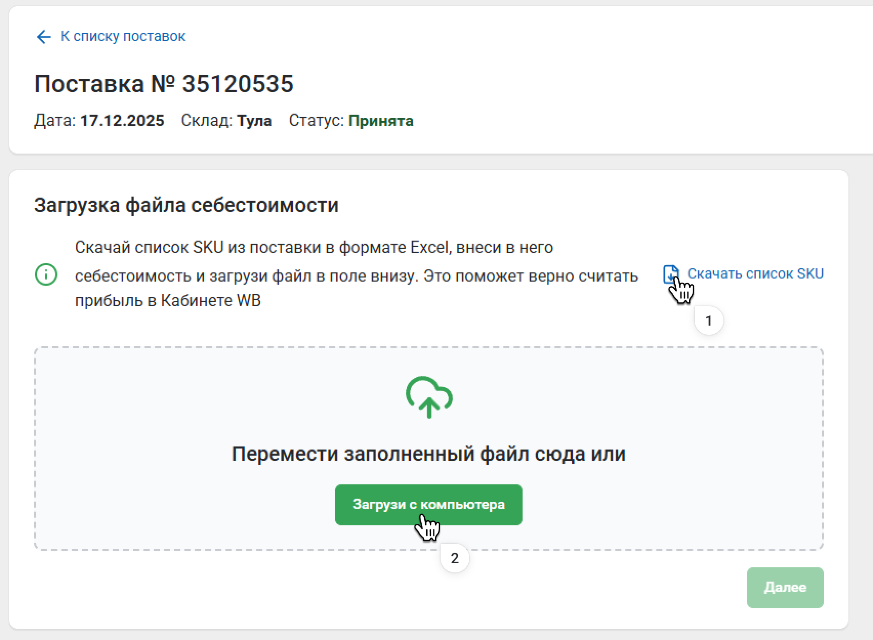 В открывшемся окне скачайте шаблон файла в формате Excel. В нем будут все SKU из поставки – укажите для них себестоимость. Когда все будет готово, загрузите файл в MPSTATS. Для этого нажмите Загрузи с компьютера или перетащите файл из папки на компьютере.