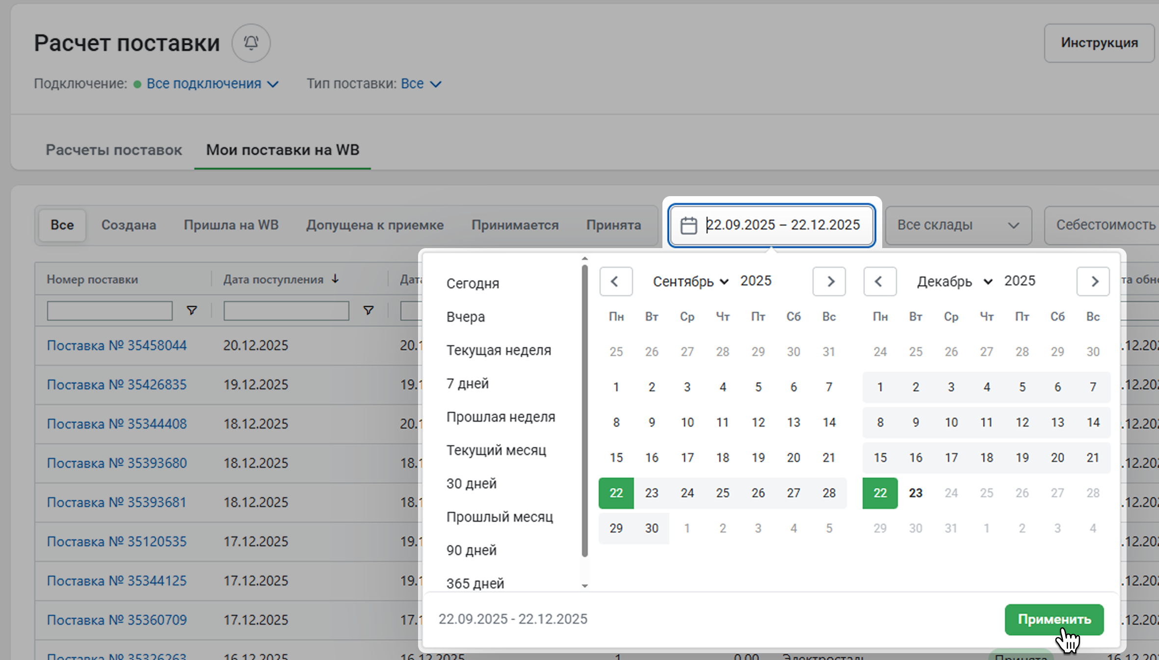 Чтобы просмотреть поставки за конкретный период, нажмите на иконку календаря. Выберите нужные даты и нажмите Применить.