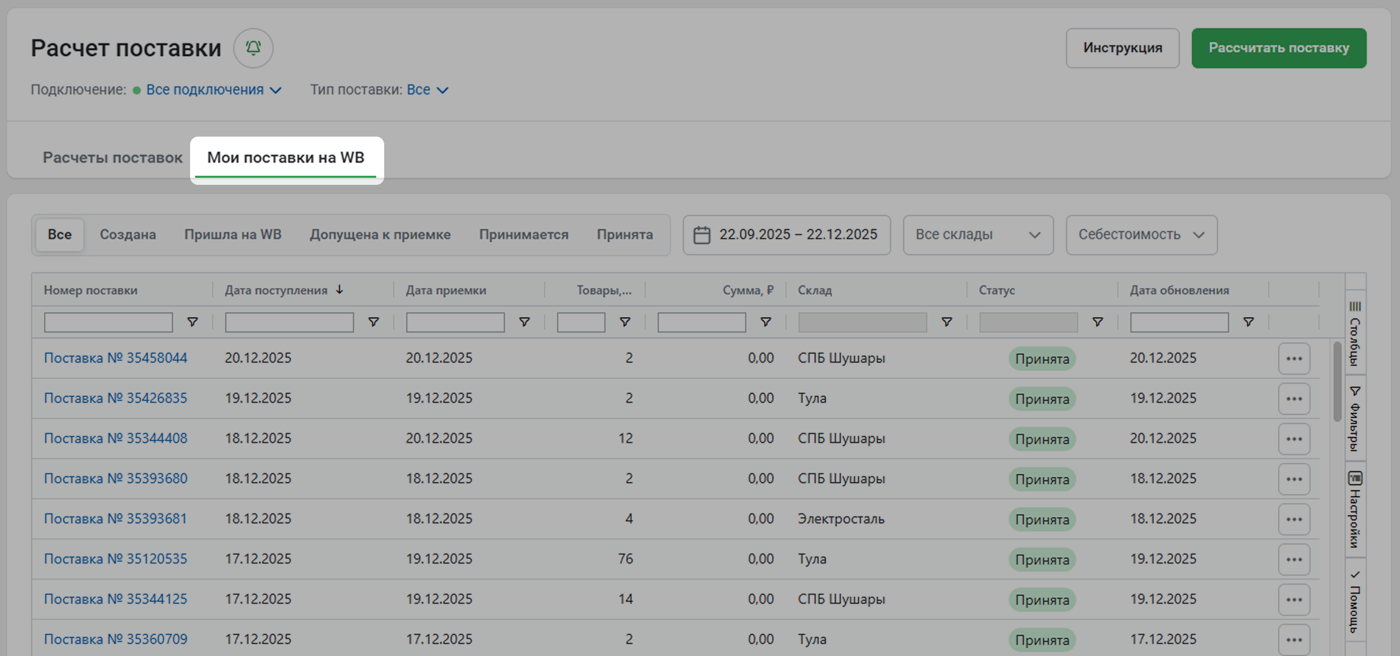 Чтобы попасть в инструмент, зайдите в Расчет поставки 2.0 и переключитесь на вкладку Мои поставки на WB.