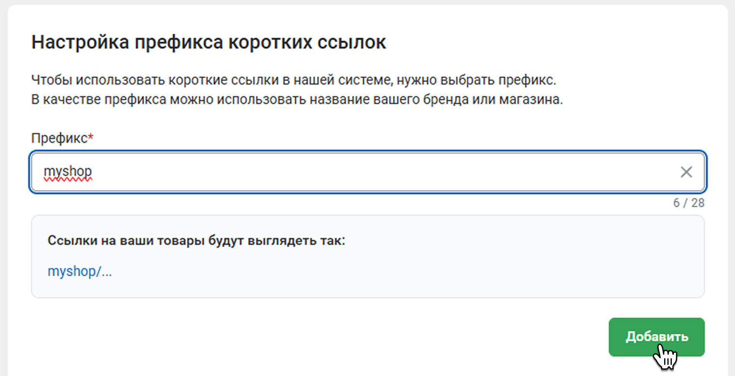 Префикс позволяет отделить ваши ссылки в нашем сервисе от ссылок других продавцов. В качестве префикса можно использовать название вашего бренда или магазина.