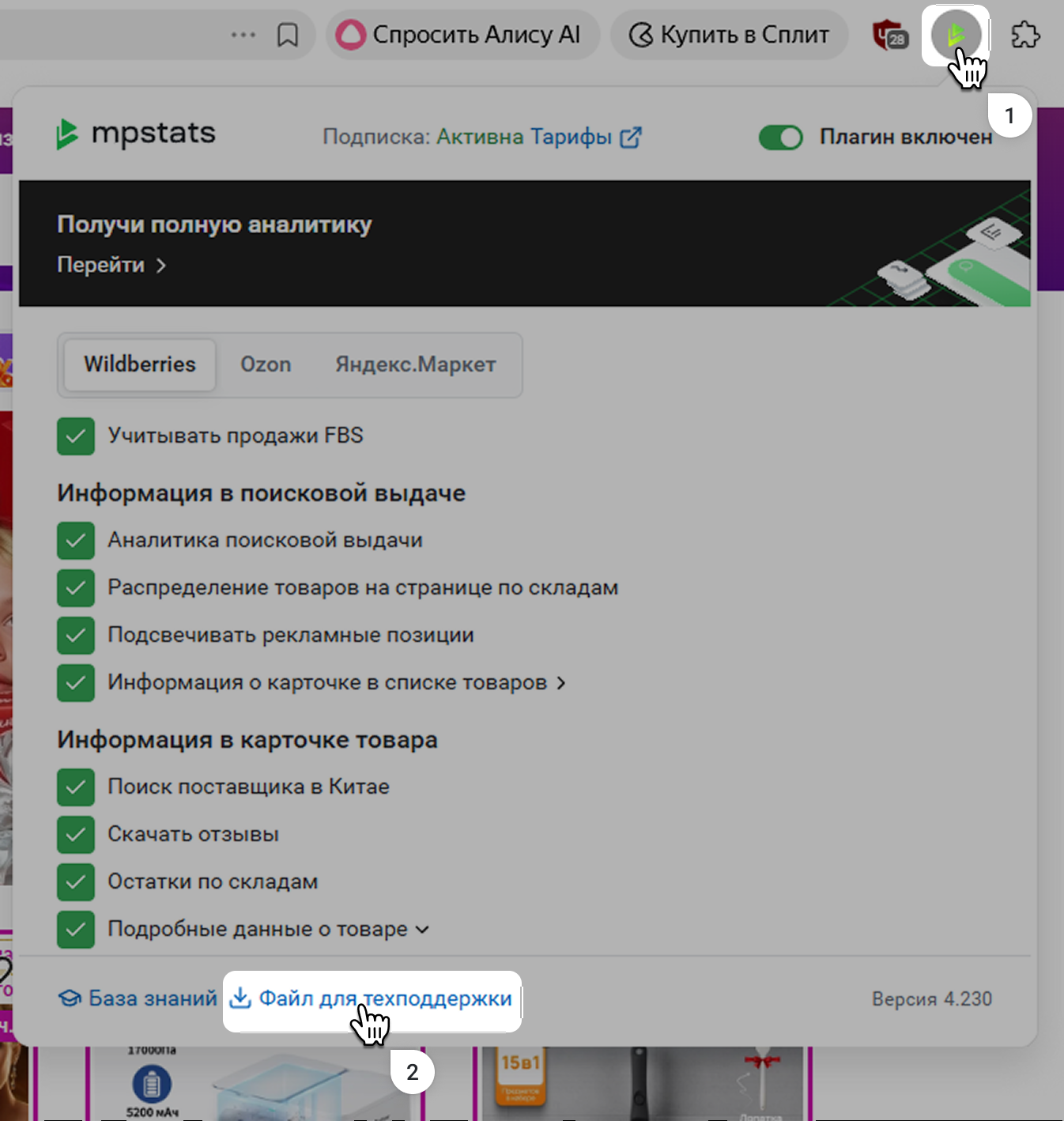 Если вы не нашли решение своей проблемы, нажмите на иконку плагина в браузере, а затем – Скачать файл для техподдержки. В этом файле сохранятся ваши последние действия при работе с плагином. После этого напишите в техподдержку MPSTATS и передайте файл об ошибке, чтобы мы могли изучить и устранить проблему.