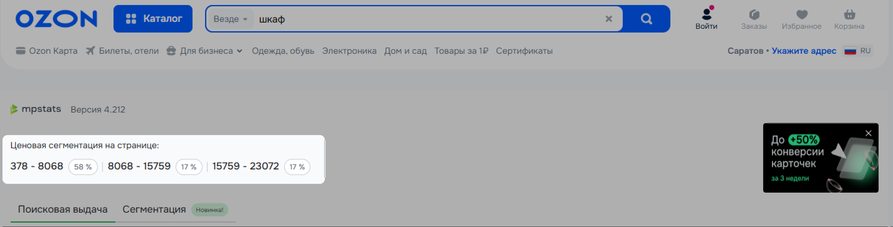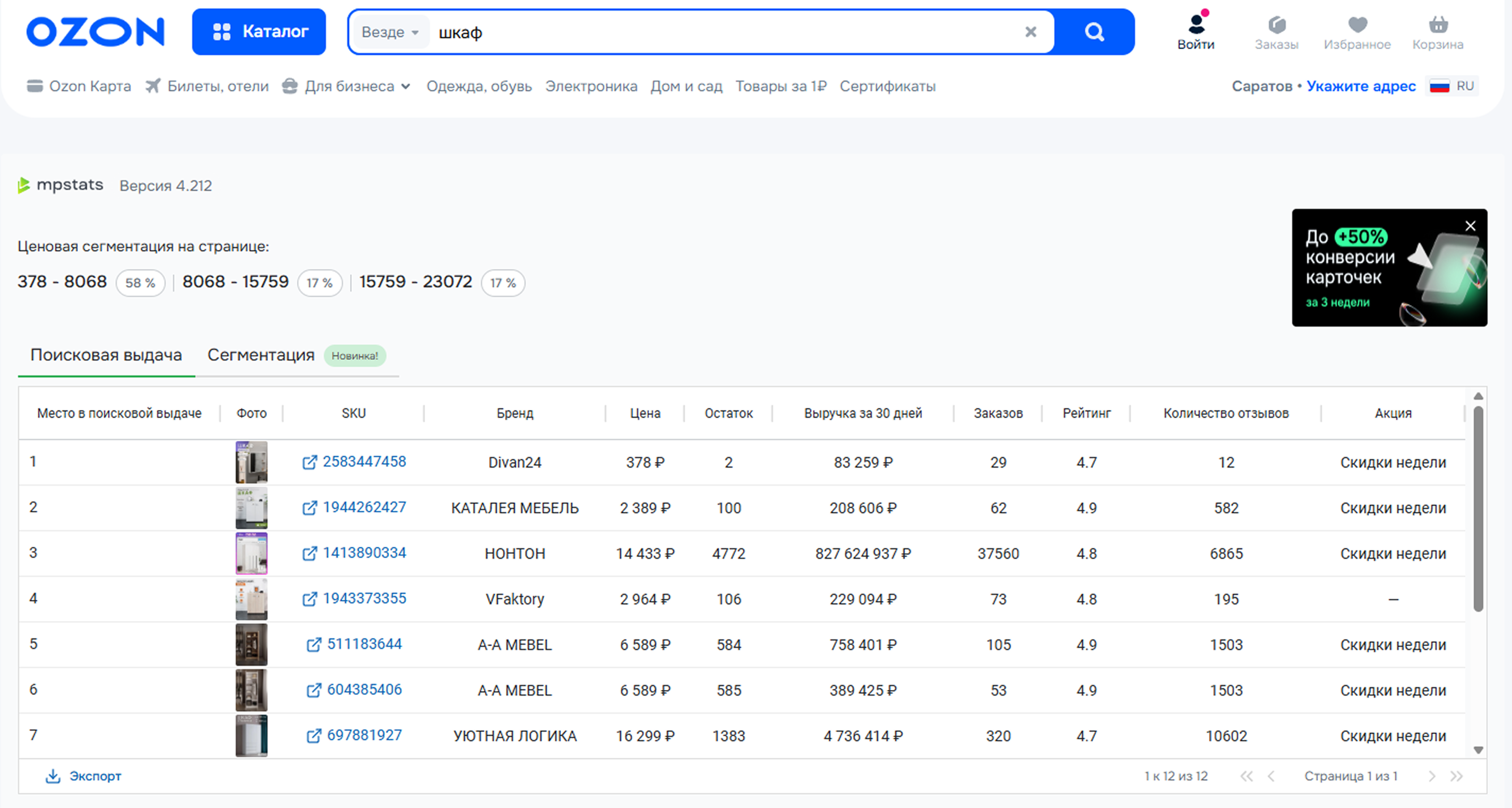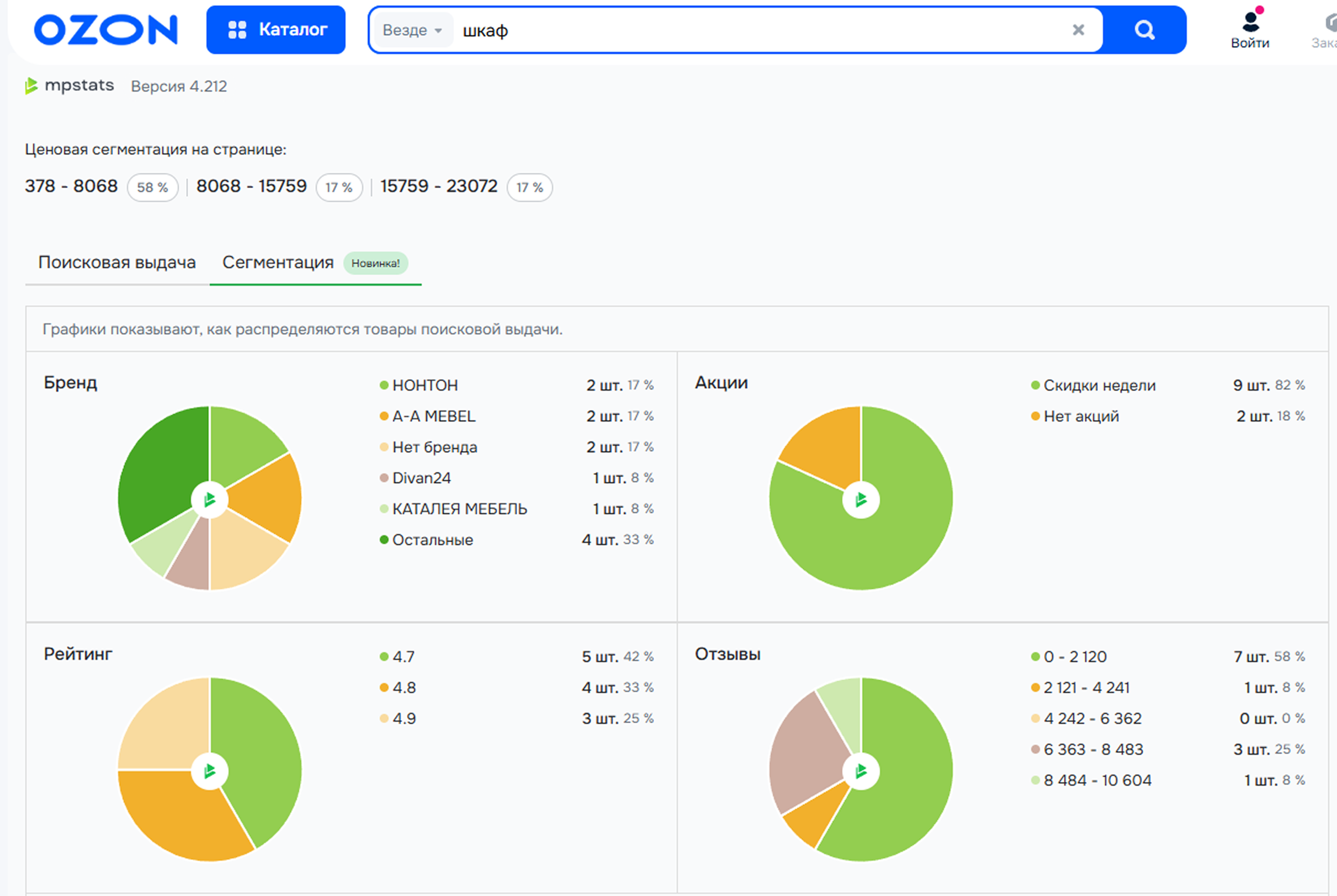 Покажем, как распределяются цены на товары на этой странице поисковой выдачи. Можно посмотреть, какой ценовой диапазон самый популярный по этому запросу. Например, на скриншоте видно, что самая популярная цена на шкафы находится в диапазоне от 378 ₽ до 8068 ₽.