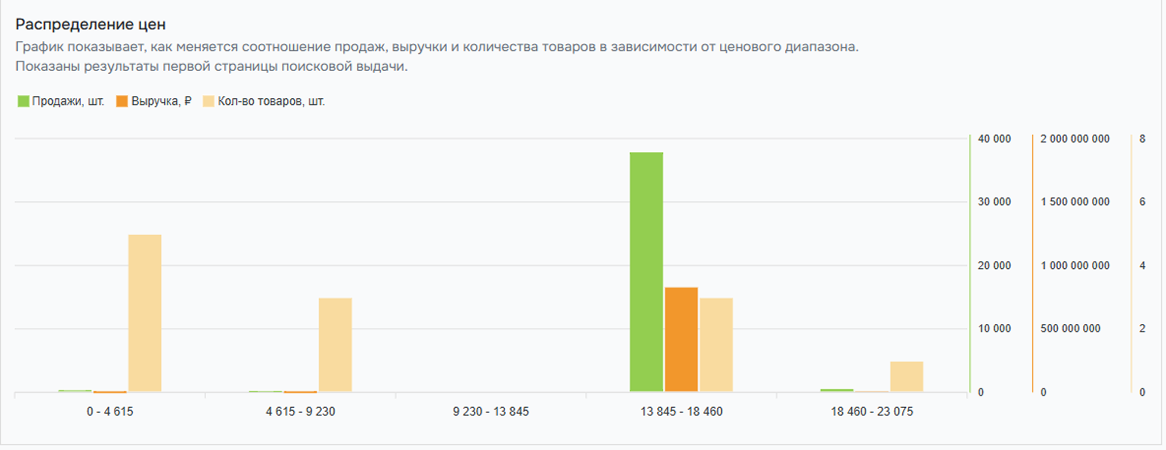 На графике Распределение цен показываем, как меняется соотношение продаж, выручки и количества товаров в зависимости от ценового диапазона.