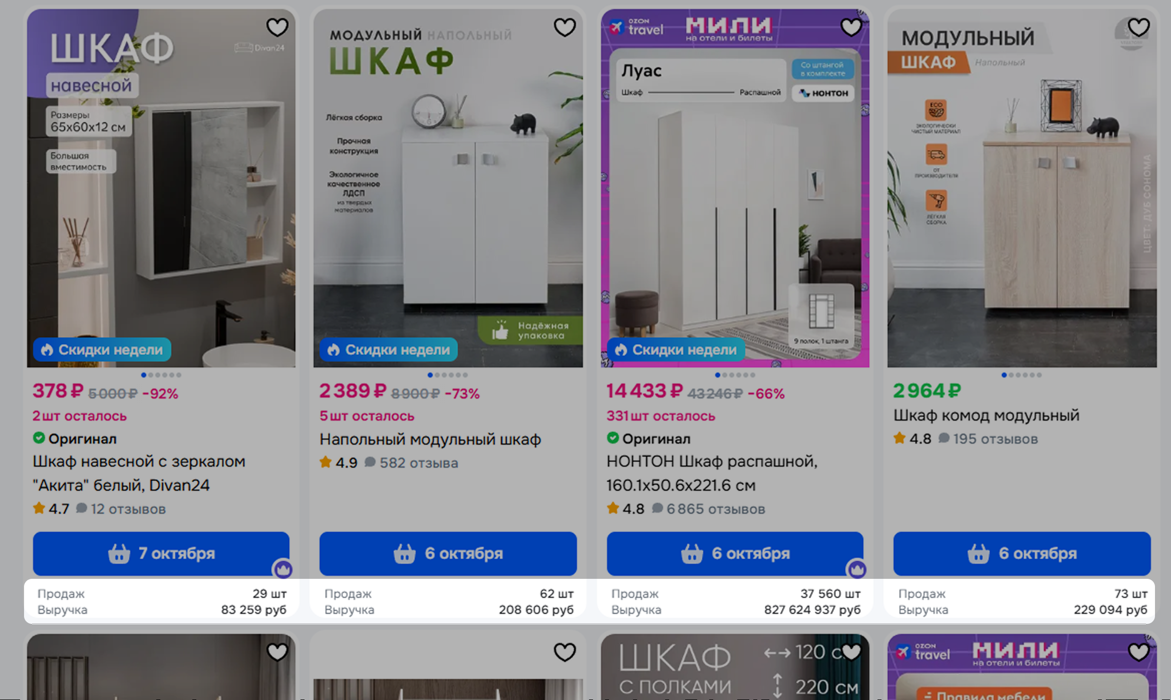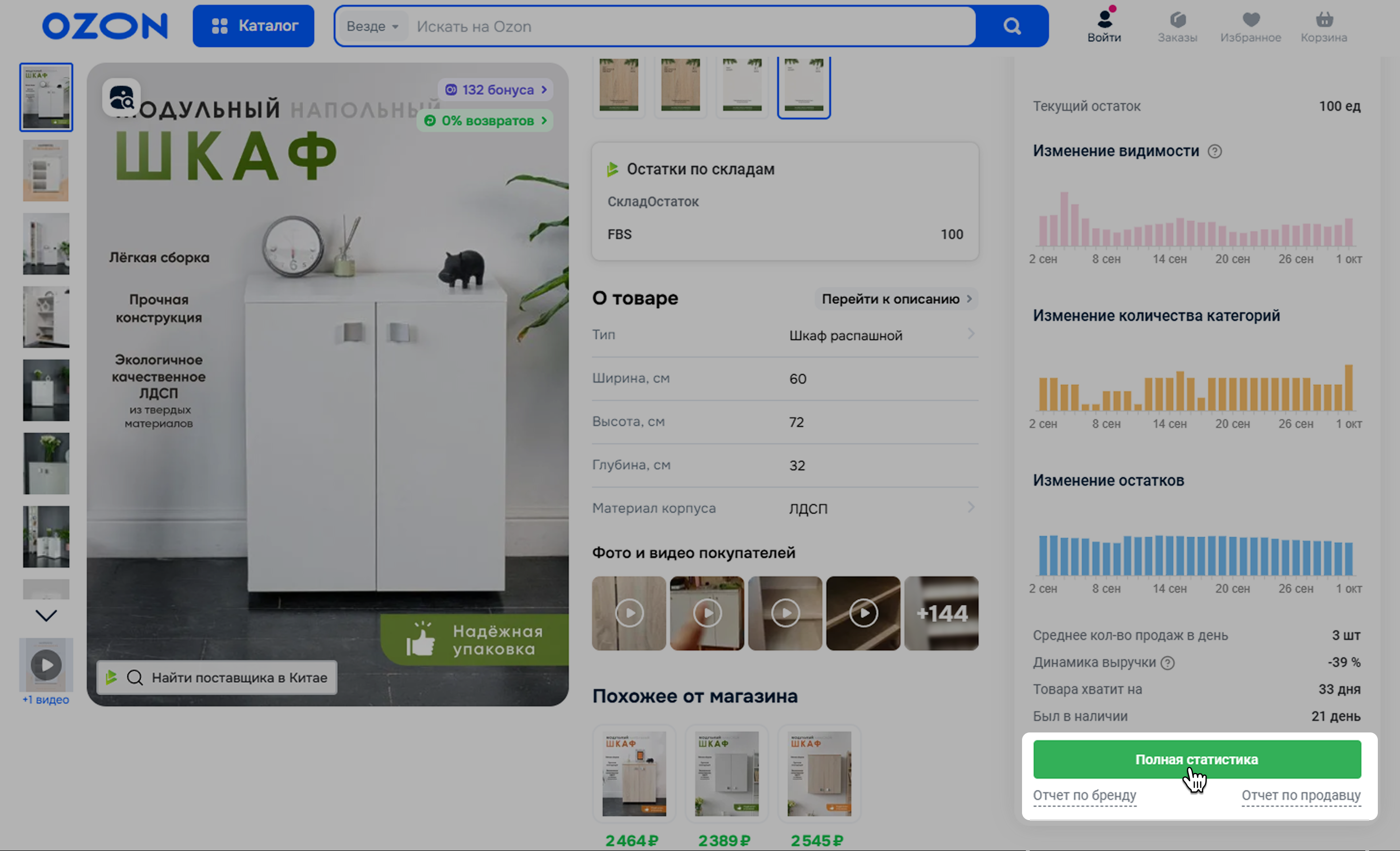 Если вы нажмете Отчет по продавцу или Отчет по бренду, то перейдете в MPSTATS в подробные отчеты. Рассказали о них в статьях Продавцы на Ozon и Бренды на Ozon.