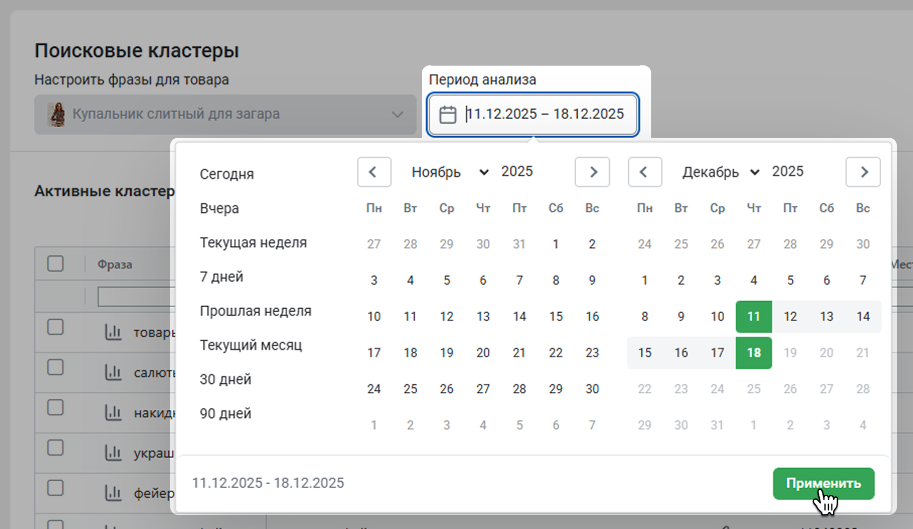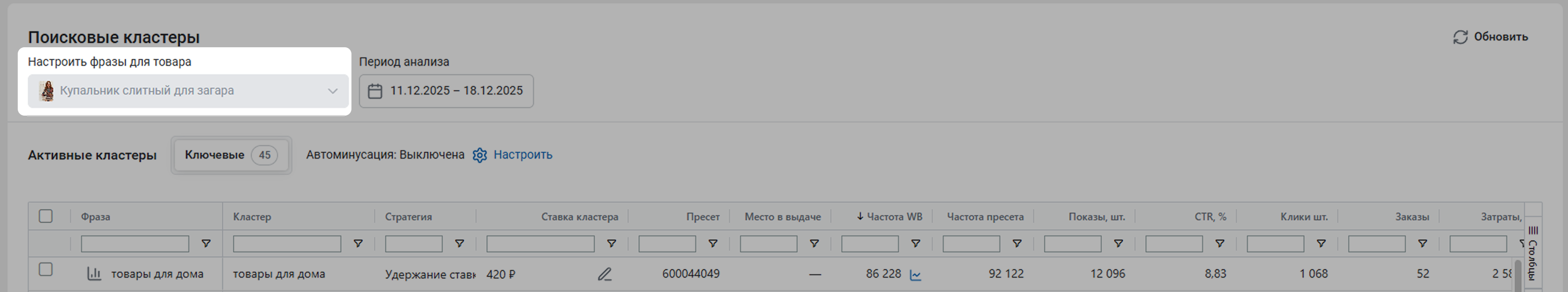 Искусственный интеллект проанализирует топовых конкурентов по товару и подберет до 5 фраз, которые подходят для вашей рекламной кампании. Вы увидите, к каким кластерам относятся эти фразы, их частоту и релевантность.
