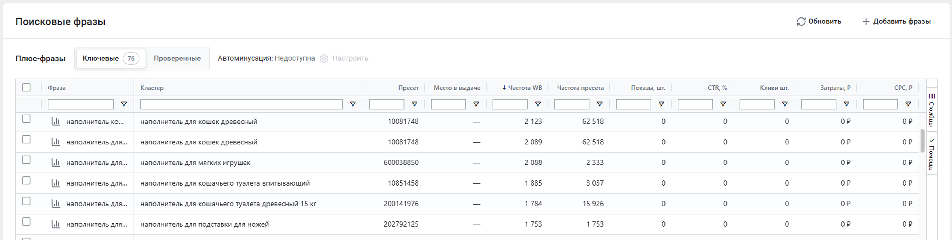 Во вкладку Ключевые попадают фразы и кластеры, которые передает нам Wildberries.