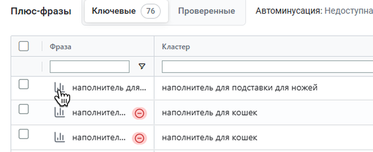 Чтобы использовать фразу в рекламной кампании Автобиддера, нажмите Применить фразу.