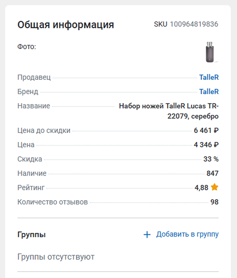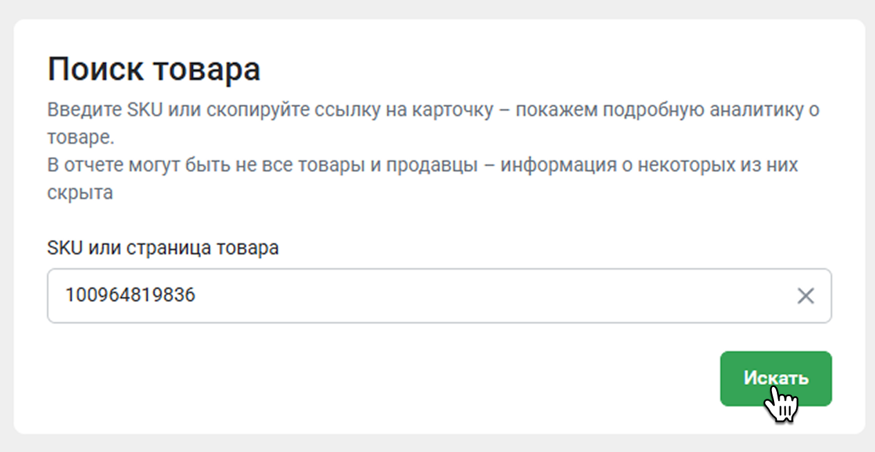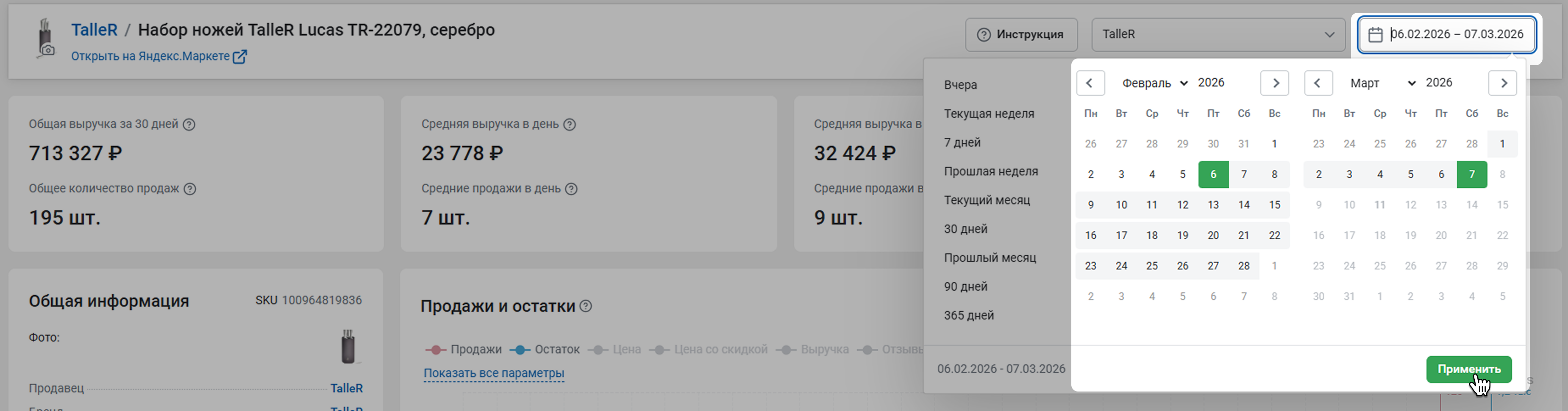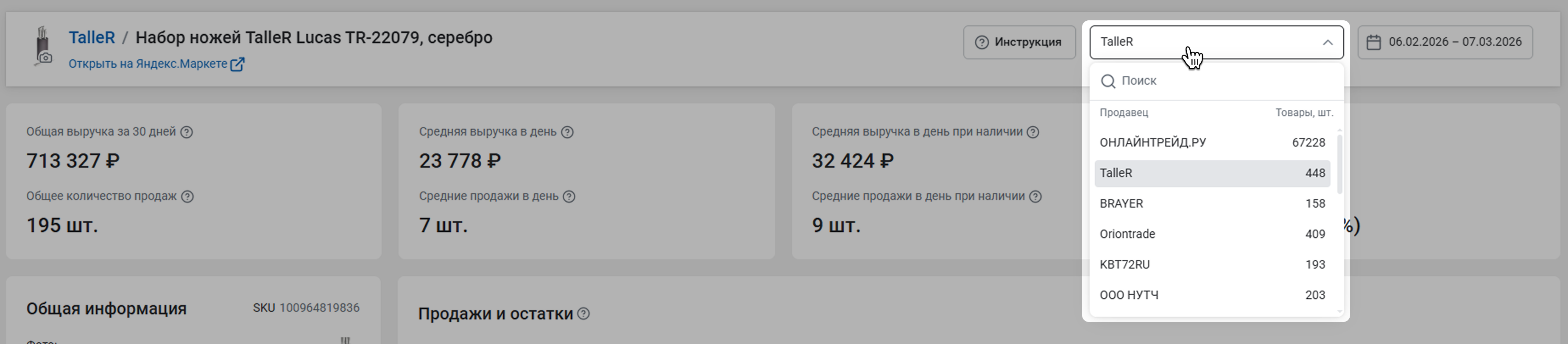 Если по вашему SKU отобразился не тот товар, нажмите на выпадающий список в правой верхней части страницы и выберите продавца. Инструмент покажет статистику нужного товара.