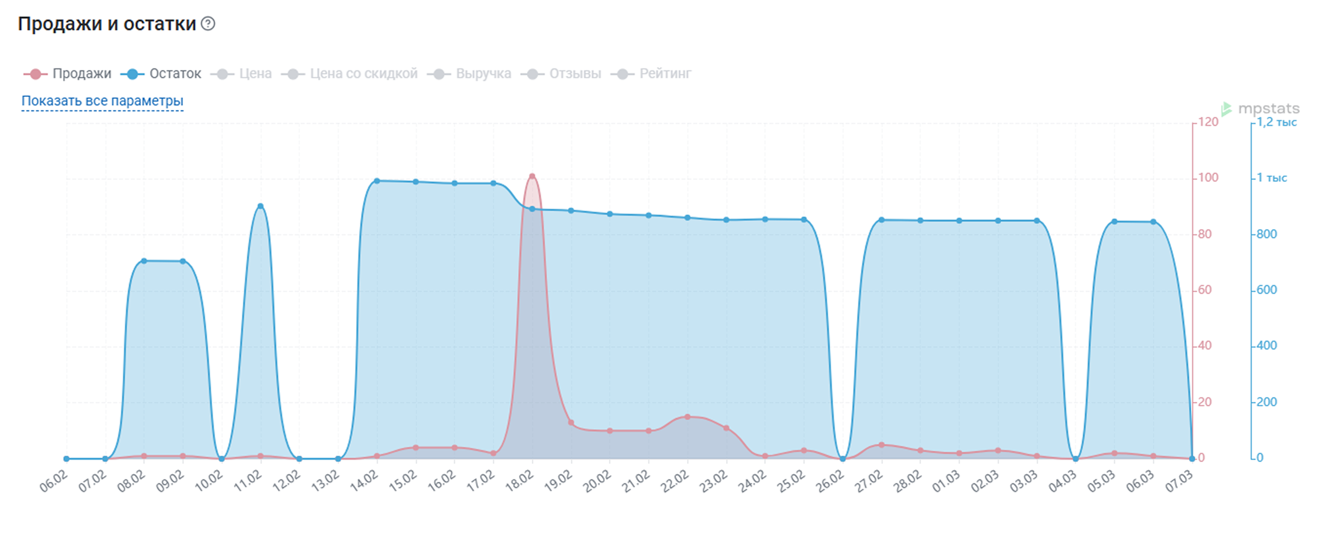 На графике можно посмотреть динамику Продаж, Остатков, Цены, Цены со скидкой, Выручки, Отзывов и Рейтинга. Чтобы добавить или скрыть показатель, нажмите на его название над графиком.