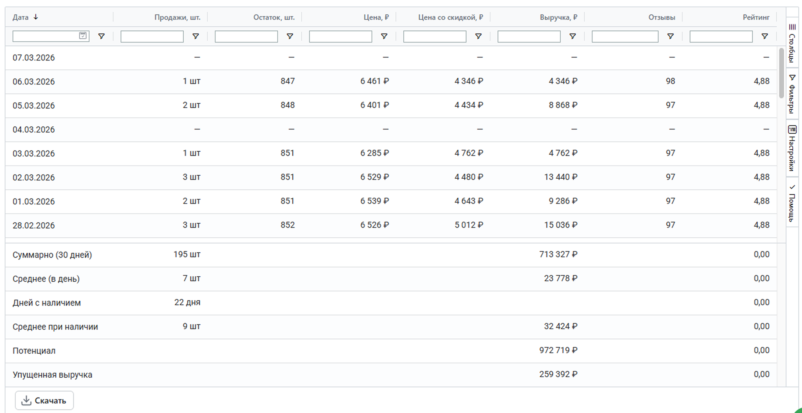 Справа от основной информации собраны данные о товаре за каждый день торговли в выбранном периоде. Информация представлена в виде графика и таблицы.
