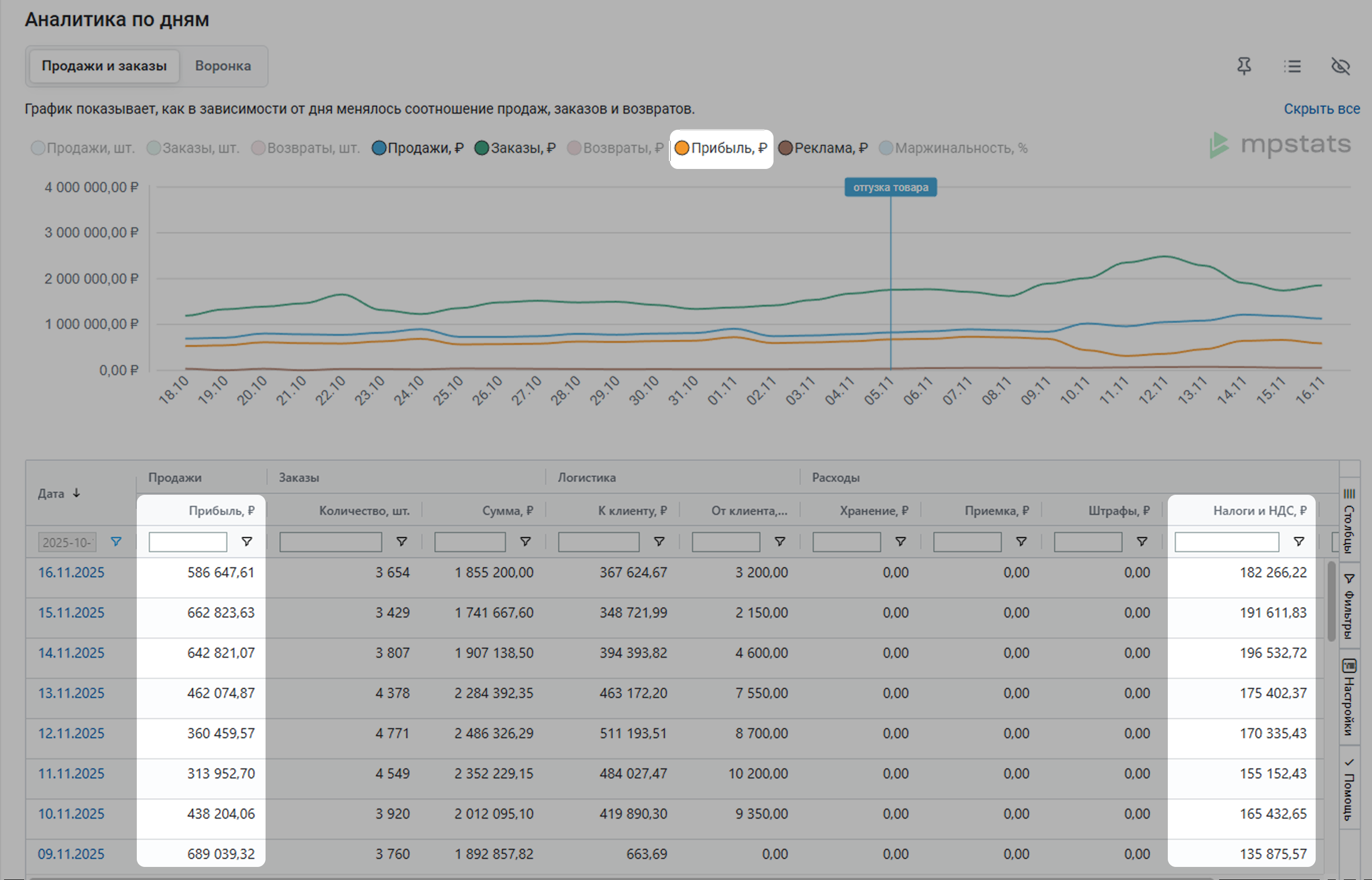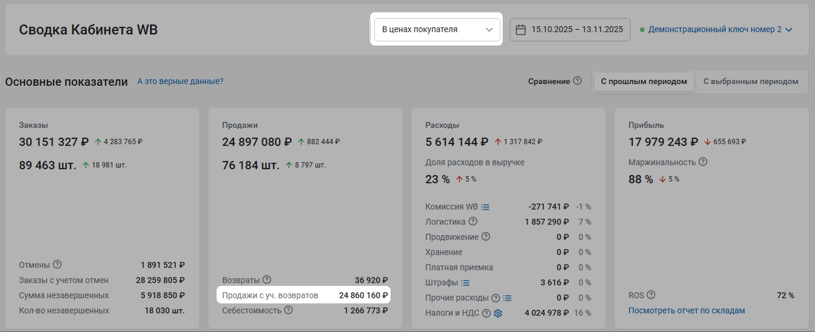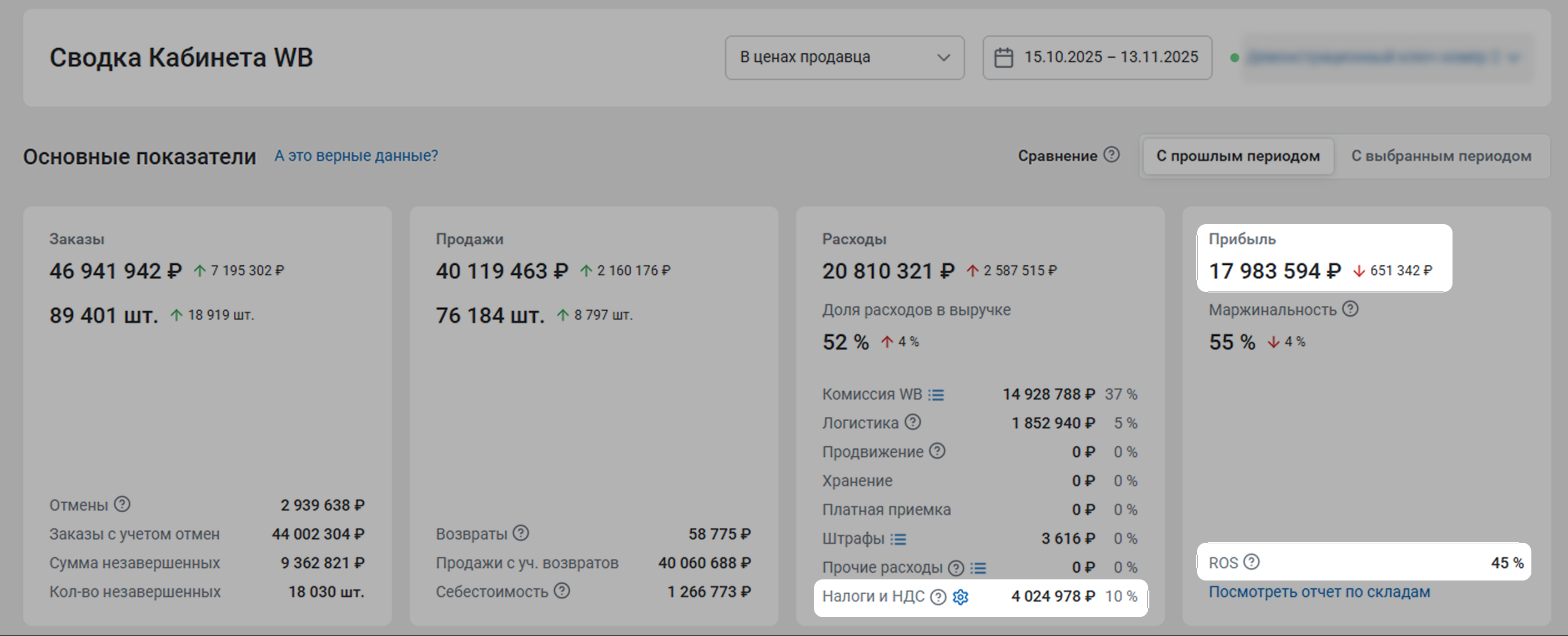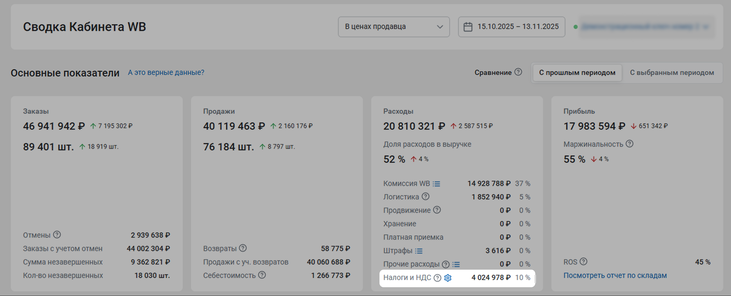 - Сумма налогов: (Выручка в финальных ценах – Возвраты) / (1 + НДС / 100) * (Налоговая ставка / 100)