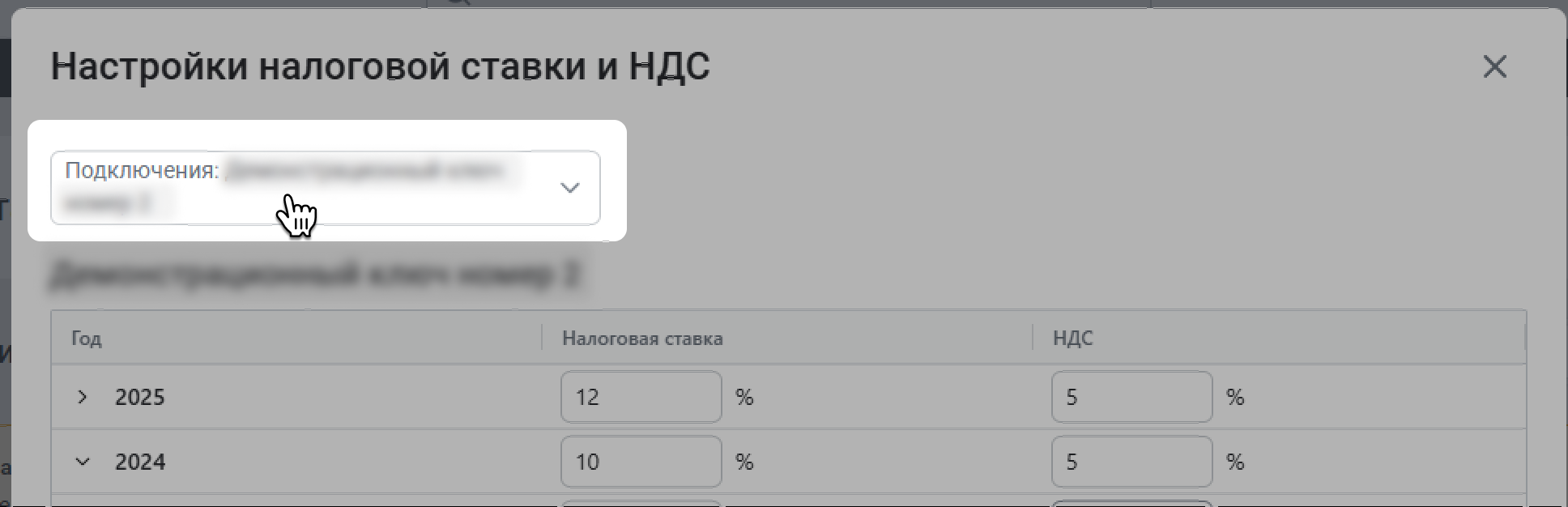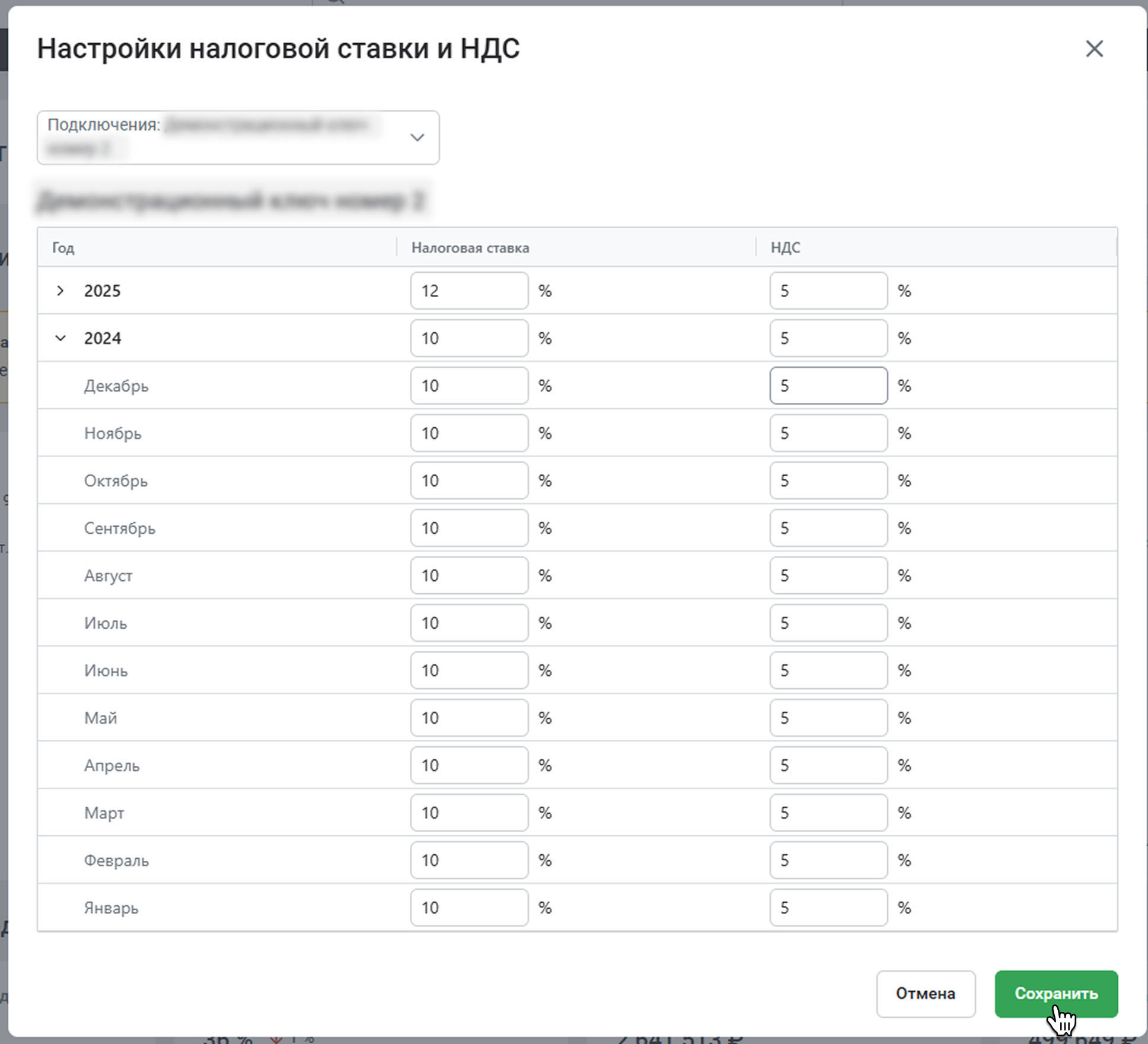 Впишите в таблицу размер налоговой ставки и НДС. Если ставка менялась на протяжении года – укажите ее по месяцам. Если нет – укажите ставку в строке с годом, и она применится ко всем месяцам.