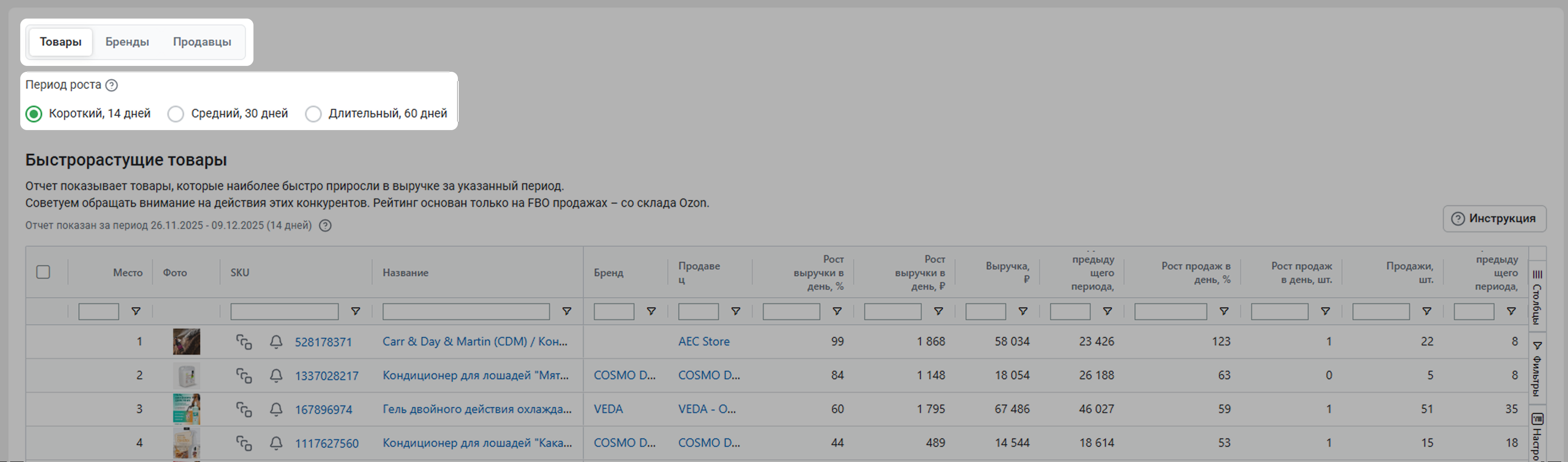 В отчете не участвуют новинки. Все товары, бренды и продавцы уже существовали на площадке как минимум 21 день, но до этого так быстро не росли