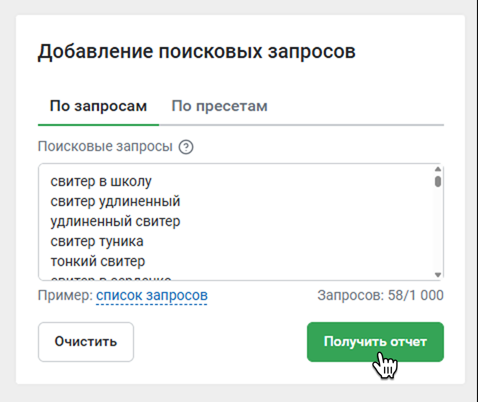 Вы можете ввести до 1000 запросов или до 100 пресетов. Количество введенных запросов будет видно внизу формы