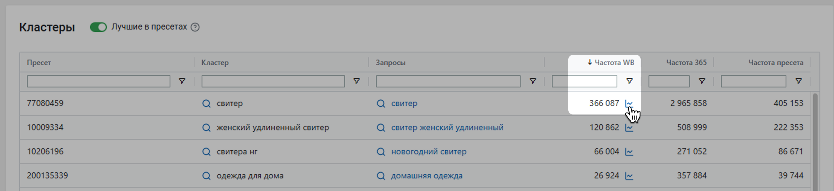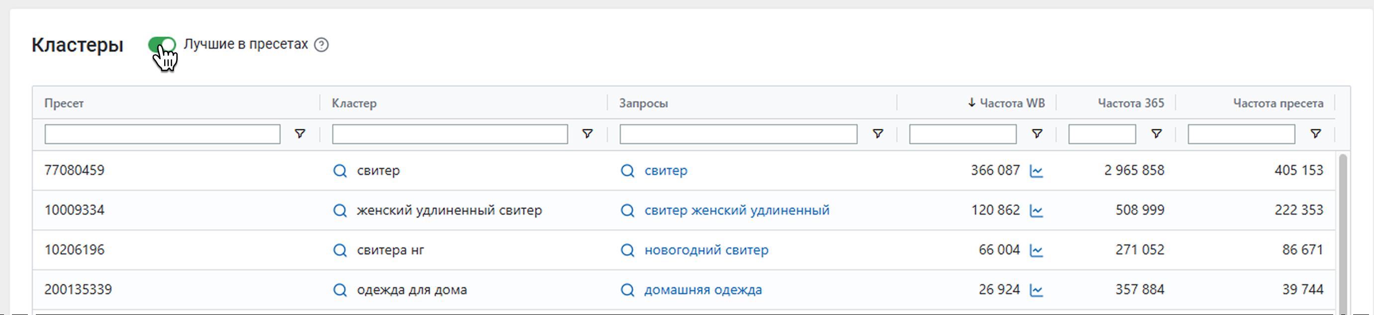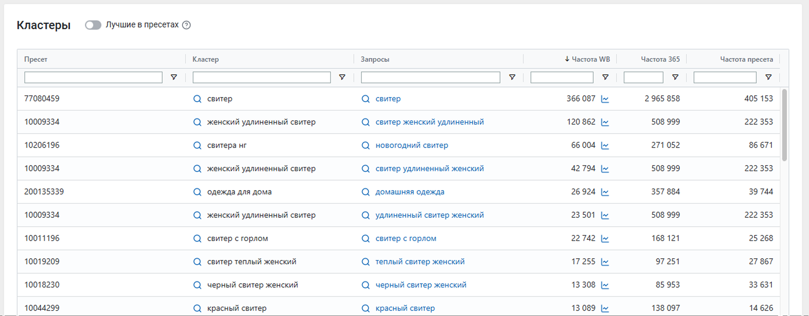 В таблице будут все кластеры по вашим запросам или пресетам. Вы можете отфильтровать список по любой колонке. Например, чтобы найти все запросы одного кластера.