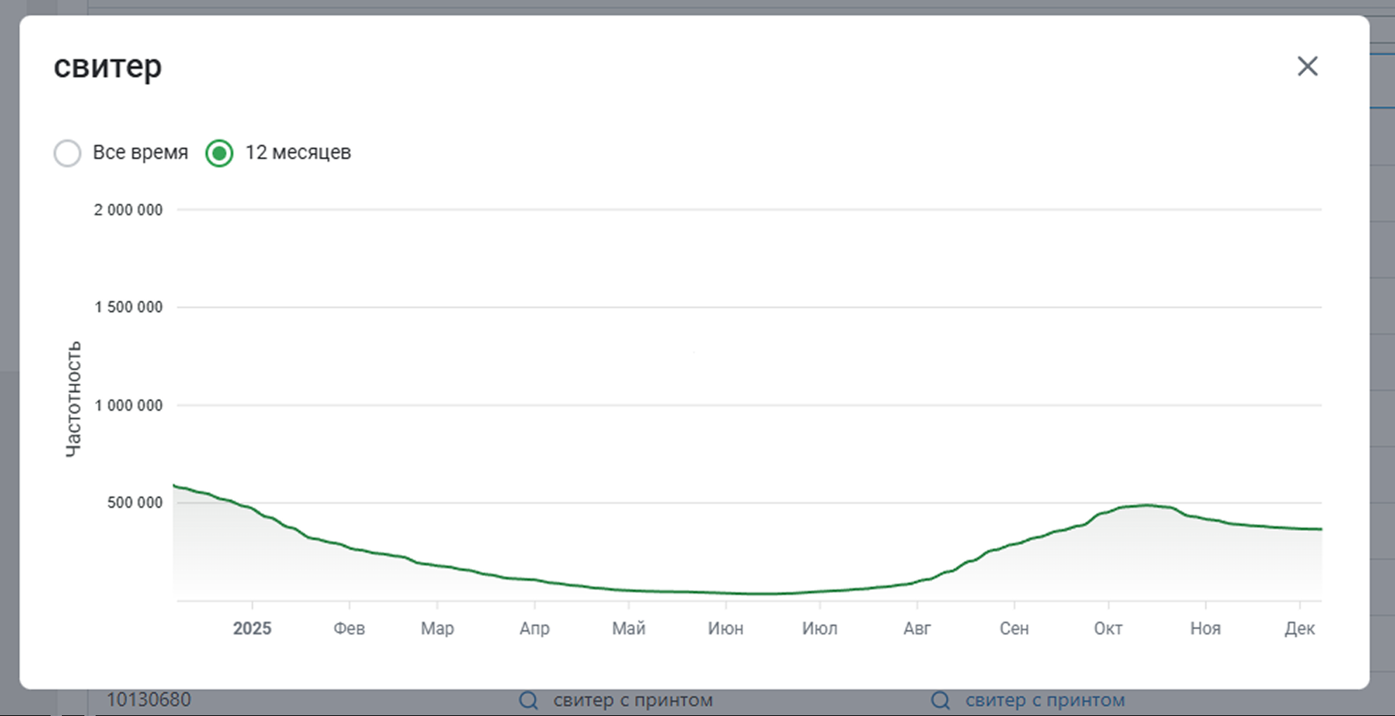 График покажет, как менялась динамика частоты запросов за 12 месяцев или за все время. Можно сравнить динамику частоты различных запросов между собой и выбрать наиболее подходящие запросы. Еще он поможет отслеживать сезонность запросов и учитывать их при формировании семантического ядра.