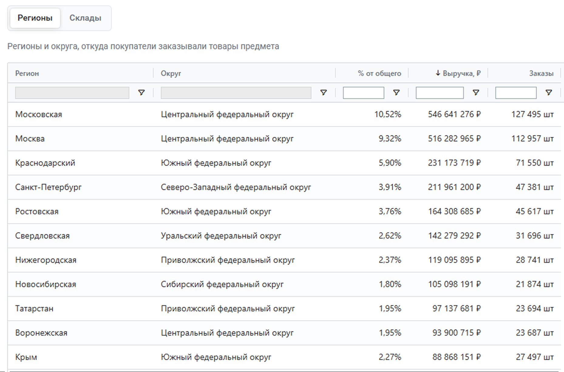 В таблице вы найдете склады, с которых товары предмета доставлялись до покупателя, и регионы и округа, в которые эти товары доставлялись. Здесь тоже есть процент от общего количества заказов предмета в этом округе, общая выручка региона и количество заказов.