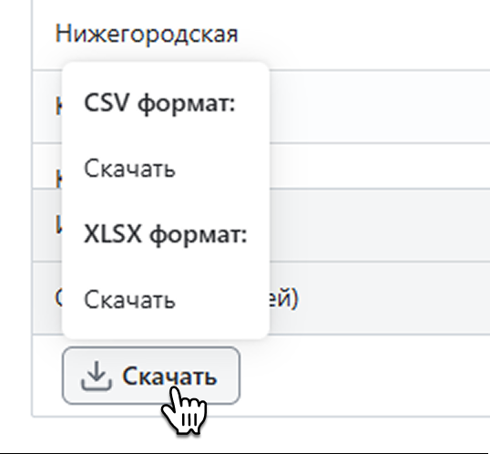 Обе эти таблицы можно скачать. Для этого нажмите Скачать в левом нижнем углу и выберите формат файла: .xlsx или .csv.