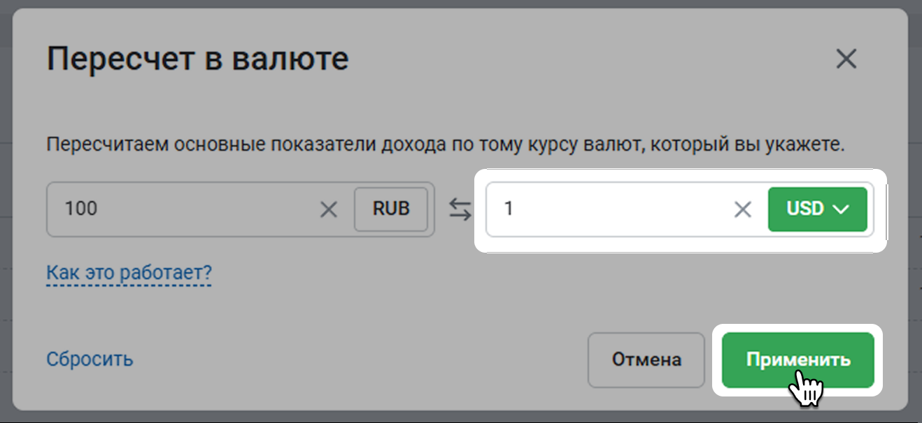 Например, сейчас выручка 10 000 ₽. Вы указываете, что 1 $ равен 100 ₽. Когда вы нажмете Применить, в таблице в графе Выручка будет 100.