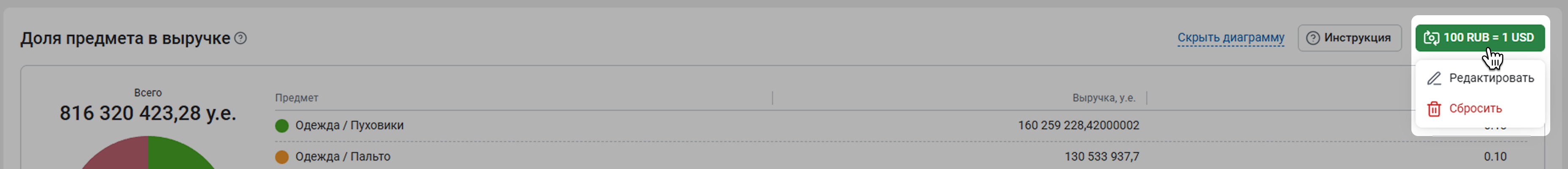 Указанный вами курс отобразится справа над таблицей. Если вы нажмете на него, откроется меню. Нажмите Редактировать, если нужно изменить курс и пересчитать показатели. Чтобы вернуть таблицу к изначальному виду, нажмите Сбросить.