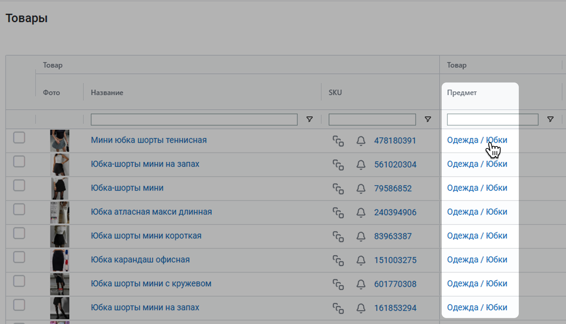 Если вы нажмете Смотреть отчет, откроется вкладка Товары. Там вы найдете всю информацию по SKU, который находятся в выбранном вами предмете. Более подробно об этом отчете вы можете прочитать в статье Товары.