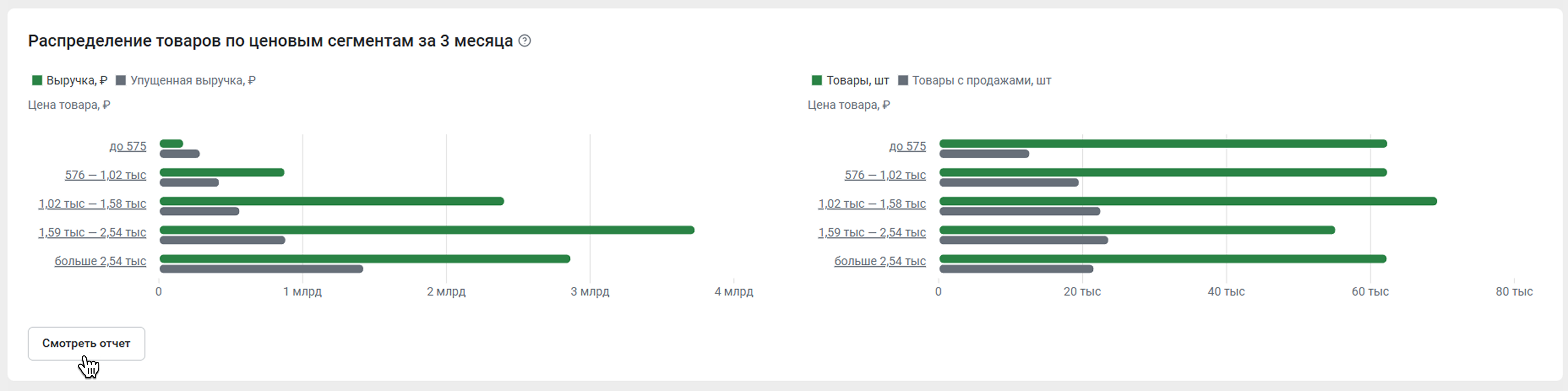 Если вы нажмете Смотреть отчет, откроется вкладка Ценовая сегментация. Это поможет отслеживать, в каком диапазоне цен оптимальное соотношение выручки, и продаж. Более подробно об этом отчете вы можете прочитать в статье Ценовая сегментация.