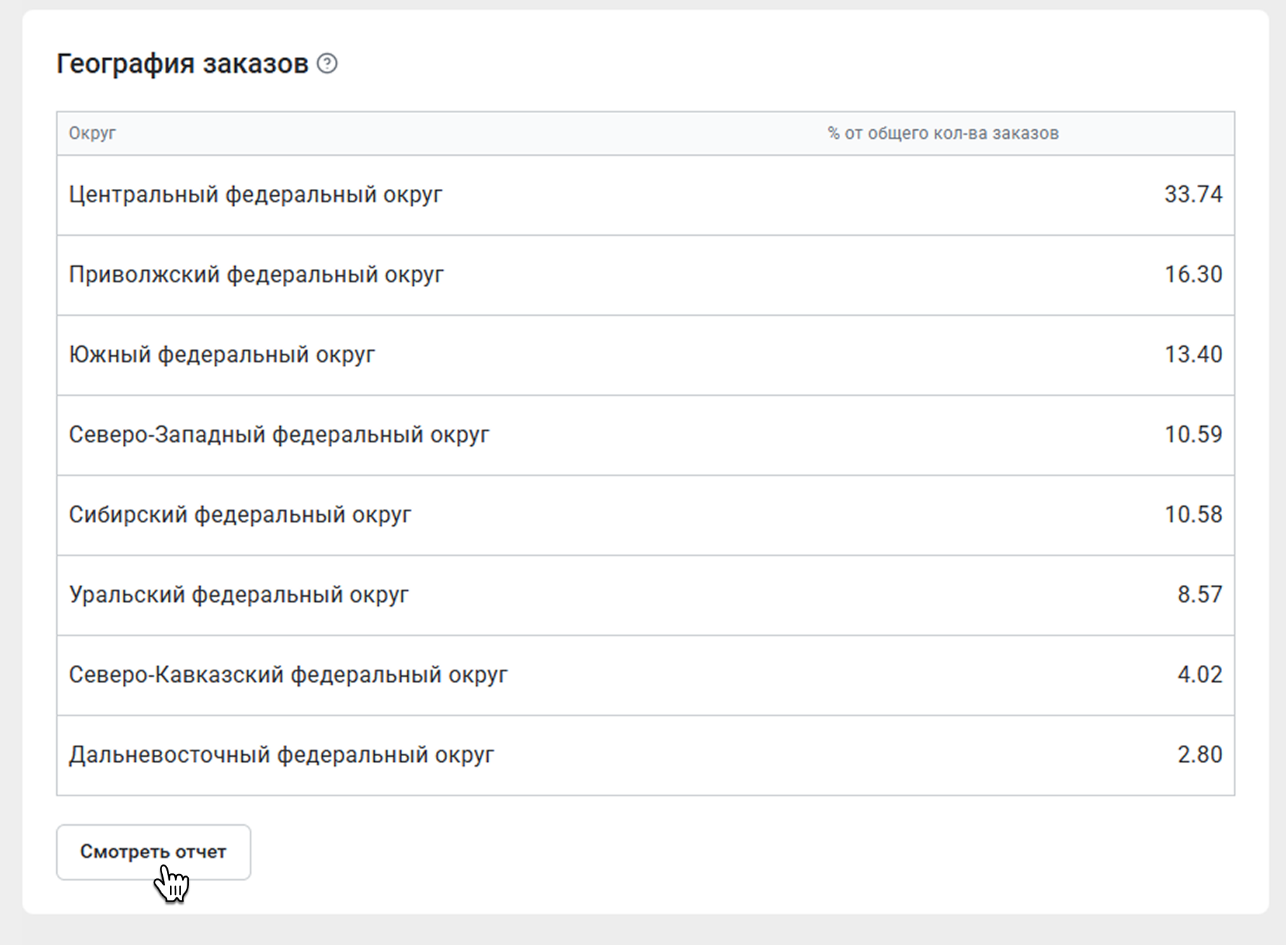 Если вы нажмете Смотреть отчет, откроется вкладка География. Более подробно об этом отчете вы можете прочитать в статье География заказов.