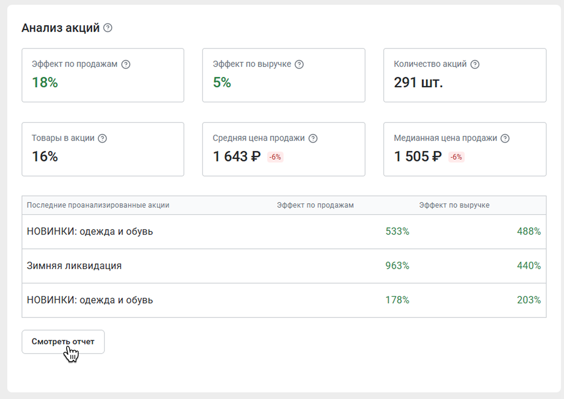 Если вы нажмете Смотреть отчет, откроется вкладка Анализ акций. Там вы сможете увидеть, выгодно ли было продавцам этого предмета участвовать в акциях. Более подробно от этом отчете можно прочитать в статье Анализ акций.