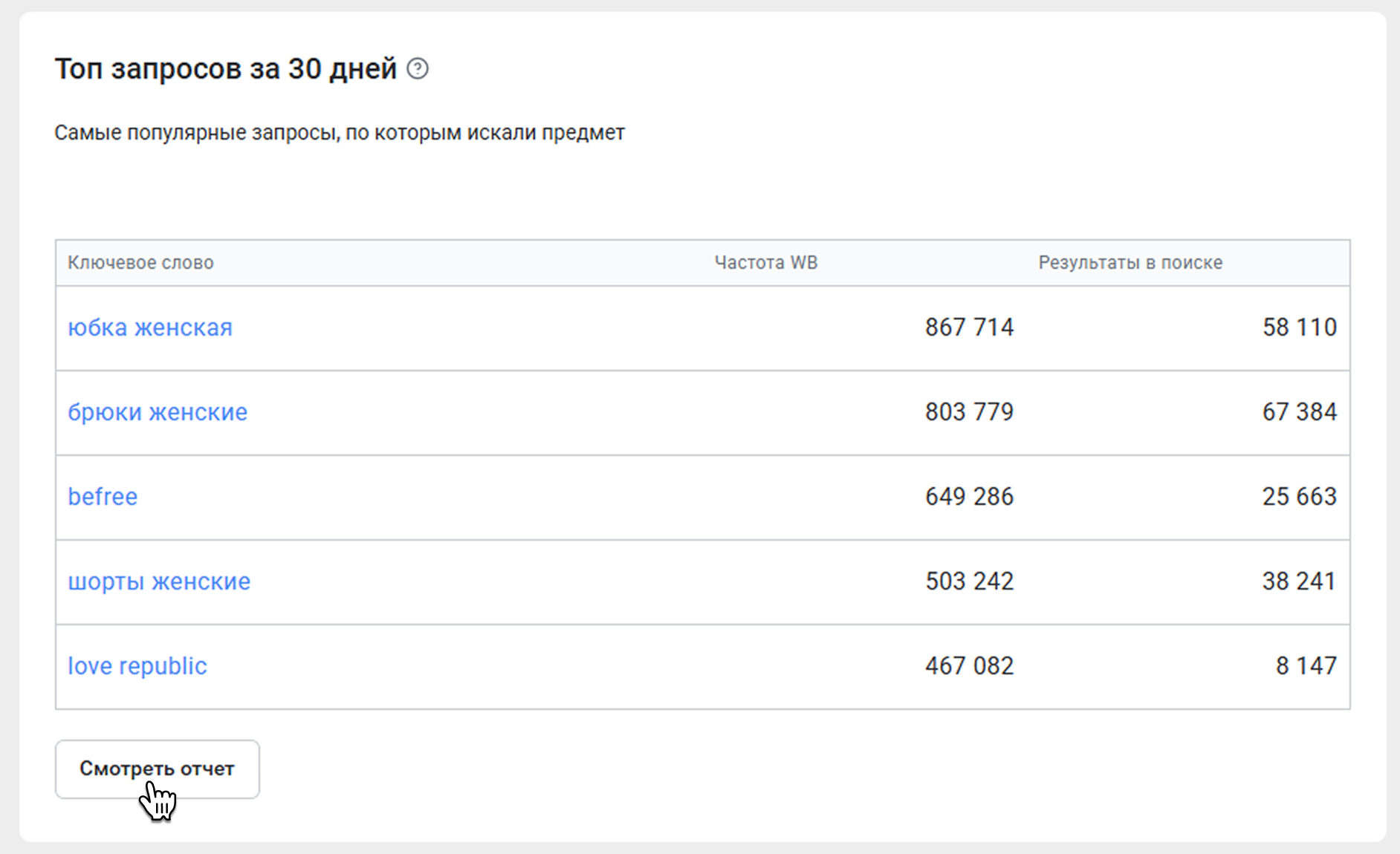 Если вы нажмете Смотреть отчет, откроется вкладка Запросы. В ней можно переключаться между запросами и ключевыми словами. Во вкладке Слова вы найдете все слова и словоформы, по которым можно найти товары в предмете, суммарную частоту на WB и OZON.