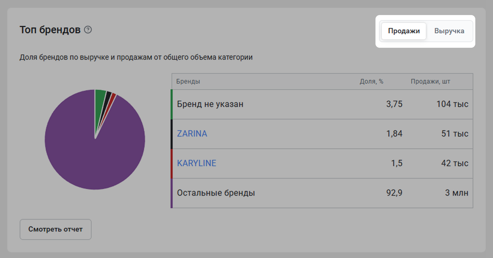Здесь вы тоже можете переключаться между общей выручкой и количеством продаж: сколько было продаж и какова доля этих продаж в предмете. Если навести мышку на диаграмму, вы увидите количество продаж конкретного бренда за 30 дней.