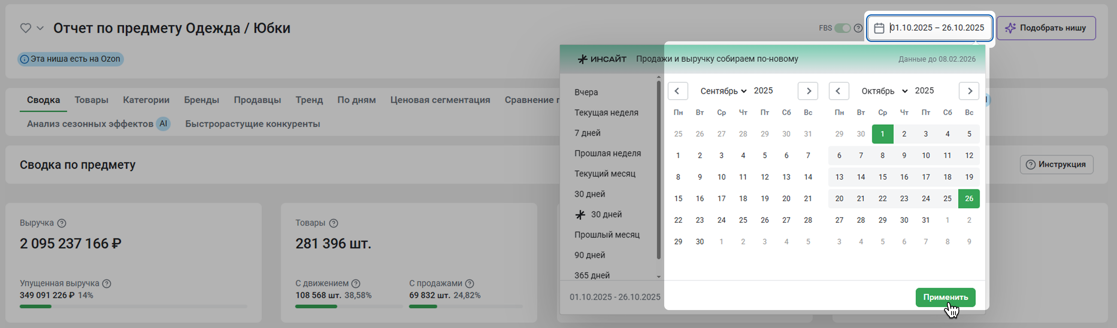 Автоматически отчет формируется за последние 30 дней, но вы можете выбрать другой период. Нажмите на поле со значком календаря и выберите временной промежуток. Нажмите Применить.