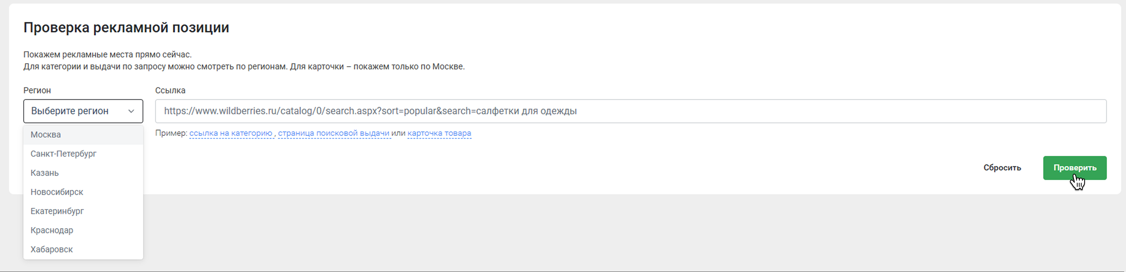 Проверка рекламной позиции показывает, как распределяются рекламные места в поисковой выдаче. Инструмент можно найти в модулях WB или Биддер.