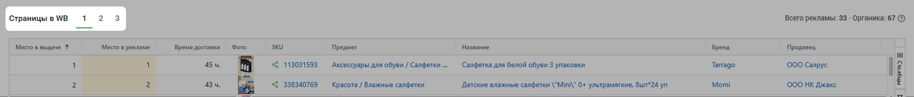 В таблице вы найдете подробную информацию по товарам в выдаче. В правом верхнем углу показываем, сколько на первой странице рекламных карточек, а сколько – органических.