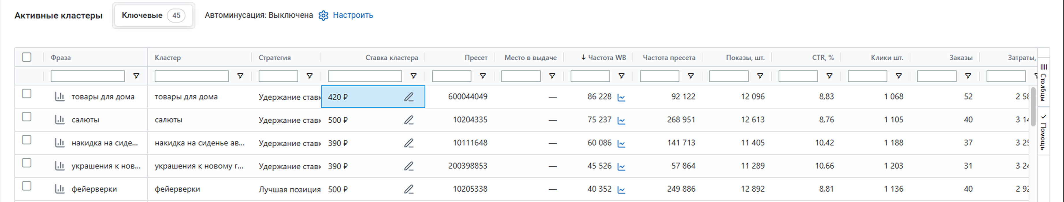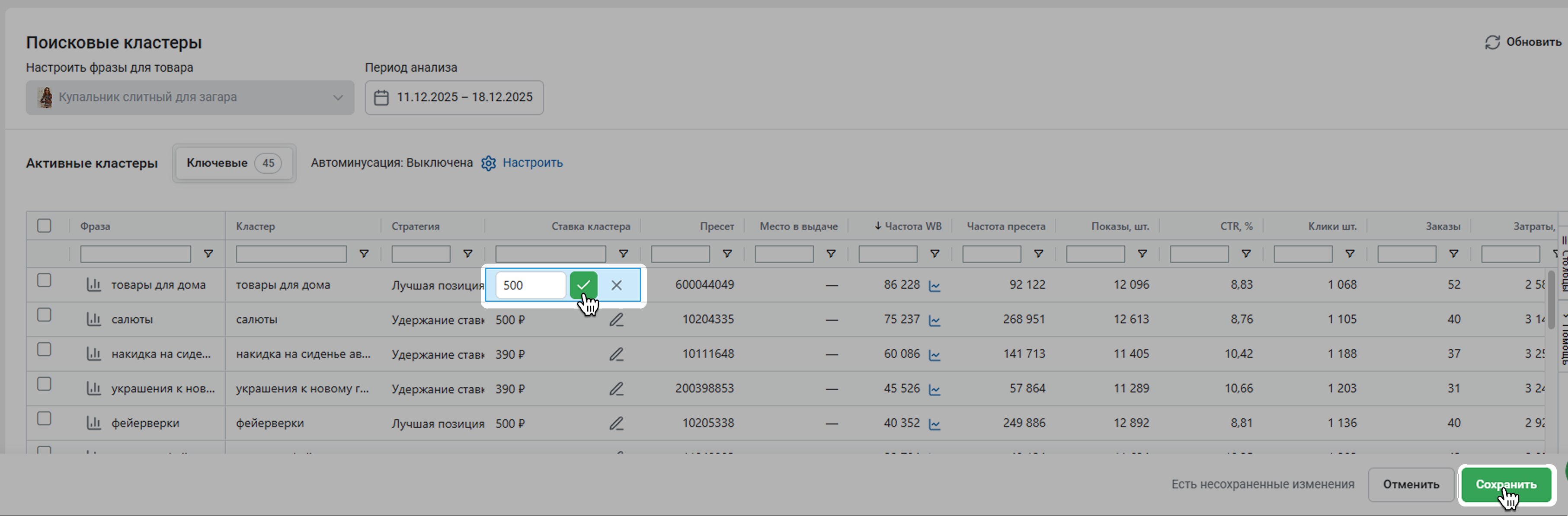 Вы можете задать особую ставку для 10 кластеров. Биддер будет продвигать товар по этим кластерам, удерживая указанную вами ставку вне зависимости от диапазона мест – как при стратегии Удержание ставки. В столбце Ставка кластера нажмите на карандаш и введите свою ставку. Нажмите на галочку, а затем – Сохранить.