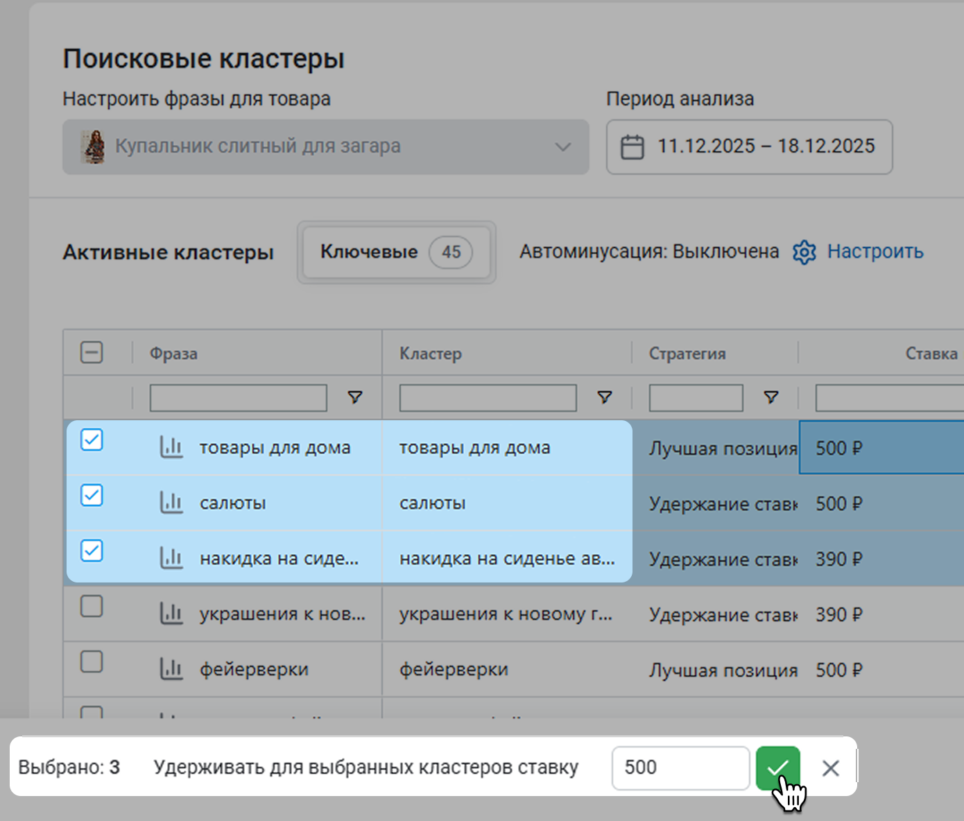 Можно задать общую ставку для нескольких кластеров. Для этого выделите кластеры галочками и в нижней части экрана укажите ставку. Нажмите на галочку, затем – Сохранить.