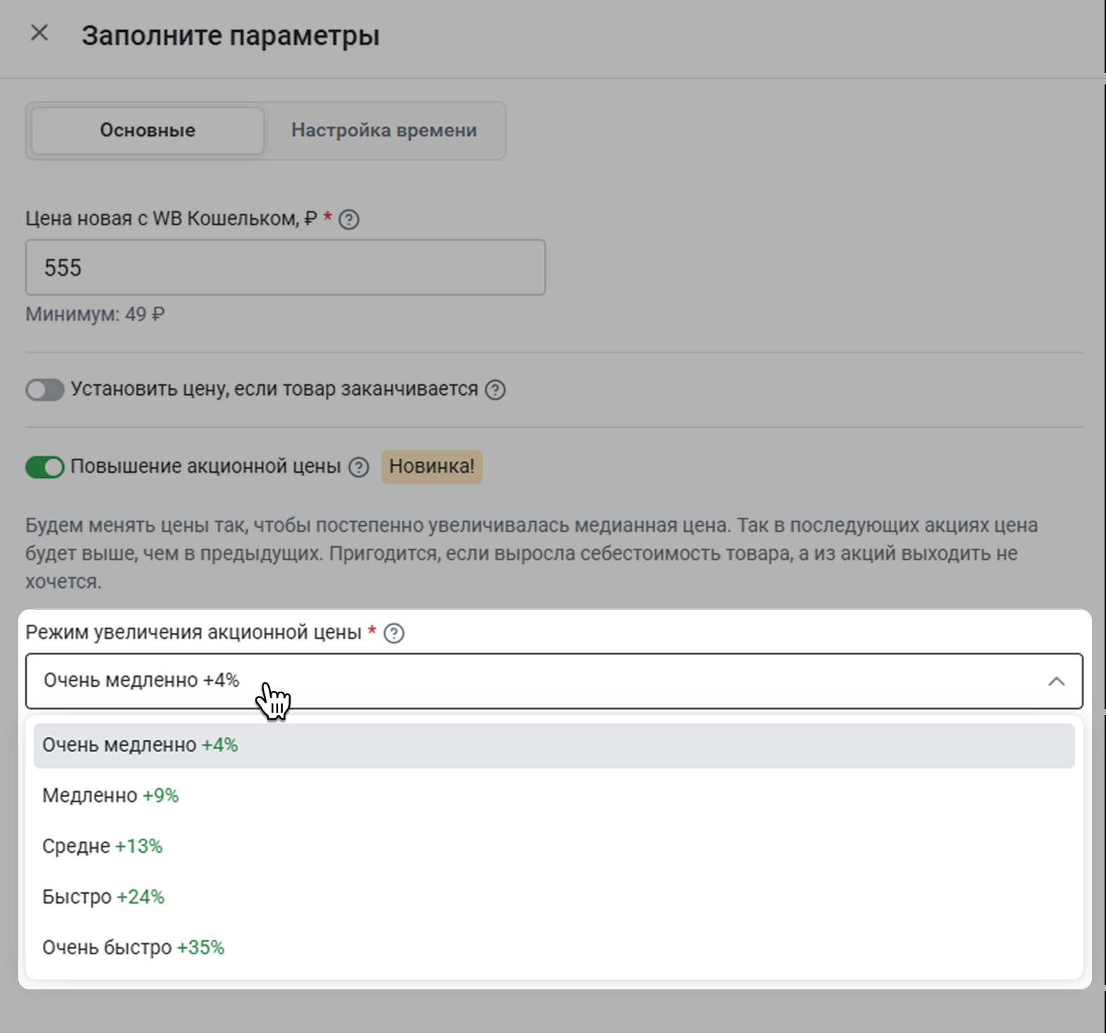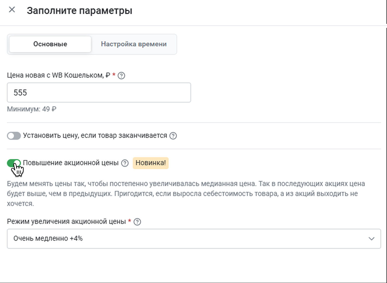Чтобы включить функцию, активируйте переключатель Повышение акционной цены.